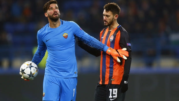 Roma goalkeeper Alisson Becker, left, discusses with Shakhtar's Facundo Ferreyra during the Champions League, round of 16, first-leg soccer match between Shakhtar Donetsk and Roma at the Metalist Stadium in Kharkiv, Ukraine, Wednesday, Feb. 21, 2018. (AP Photo/Efrem Lukatsky) AP Photo/Efrem Lukatsky