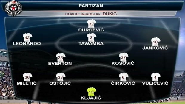 Στον πάγκο έμεινε, όπως αναμενόταν, ο Σεϊντουμπά Σουμά, ακριβότερη μεταγραφή στην ιστορία της Παρτίζαν (1,6 εκατ. ευρώ από την Σλόβαν Μπρατισλάβας) και σε θέση να αγωνιστεί 20 – 30 λεπτά σε τέτοια επίπεδο αυτή την εποχή. Διάταξη 4-2-3-1 και για την Παρτίζαν.