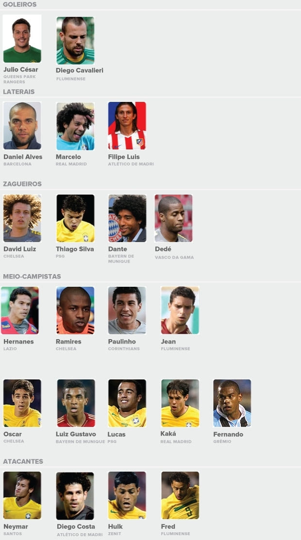 Εκτός του Κακά, στην εθνική επιστρέφουν οι Ντιέγκο Κόστα (Ατλέτικο), Ντεντέ (Βάσκο), Ντιέγκο Καβαλιέρι (Φλουμινένσε), Φερνάντο (Γκρέμιο), Λουίζ Γκουστάβο (Μπάγερν), Τιάγκο Σίλβα (Παρί ΣΖ) και Μαρσέλο (Ρεάλ).