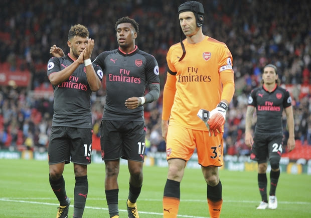 Arsenal's Alex Oxlade-Chamberlain, left, Arsenal's Alex Iwobi and Arsenal's Petr Cech, right, after the English Premier League soccer match between Stoke City and Arsenal at the Bet365 Stadium in Stoke on Trent, England, Saturday, Aug. 19, 2017. (AP Photo/Rui Vieira)
