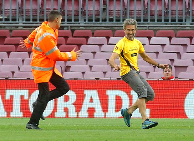 Εισβολή φιλάθλου της Μπαρτσελόνα στον αγωνιστικό χώρο του “Καμπ Νόου” στο παιχνίδι με την Λας Πάλμας την ημέρα του δημοψηφίσματος. Το μπλουζάκι του γράφει “τρέξε για την ανεξαρτησία” (1/10/2017)