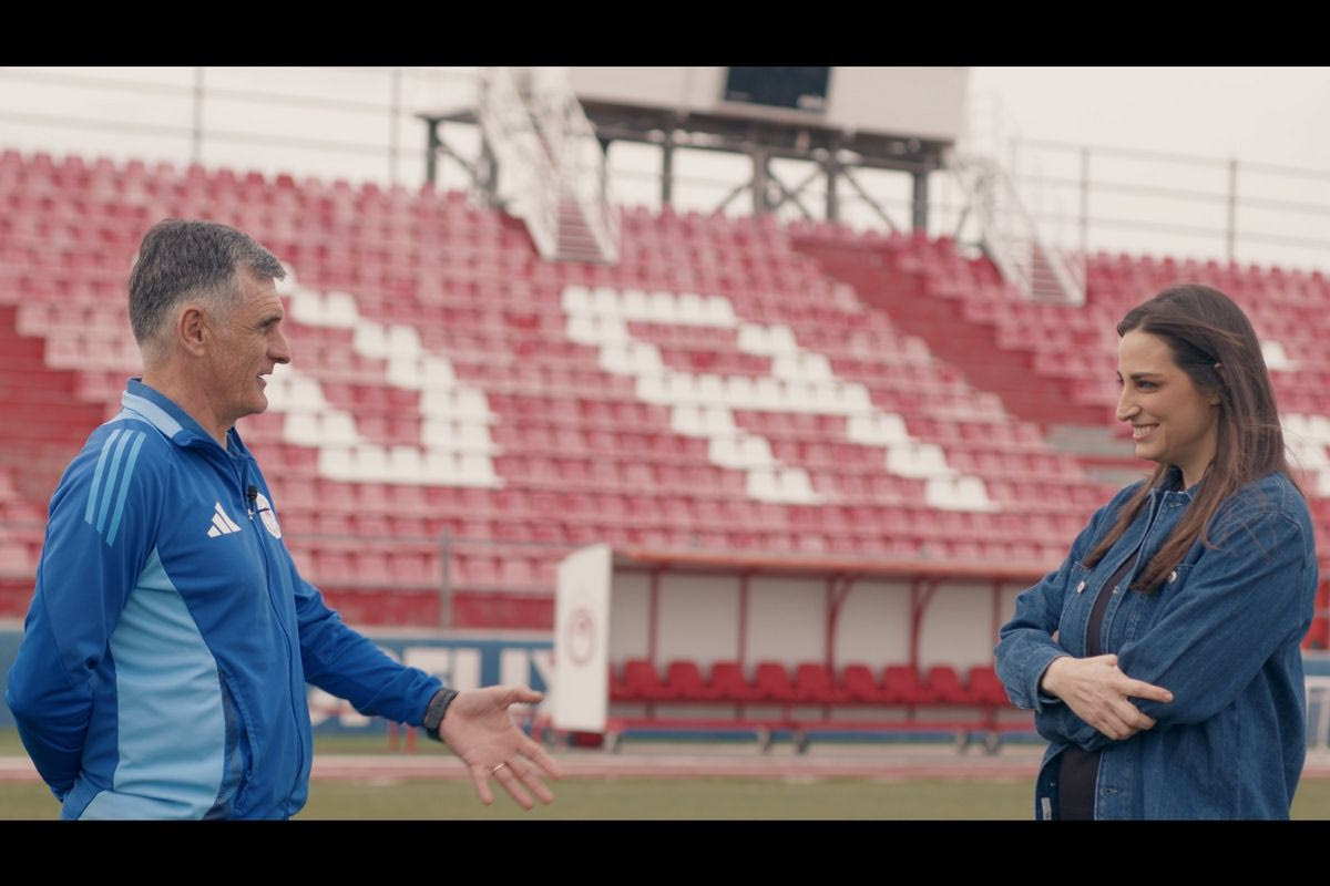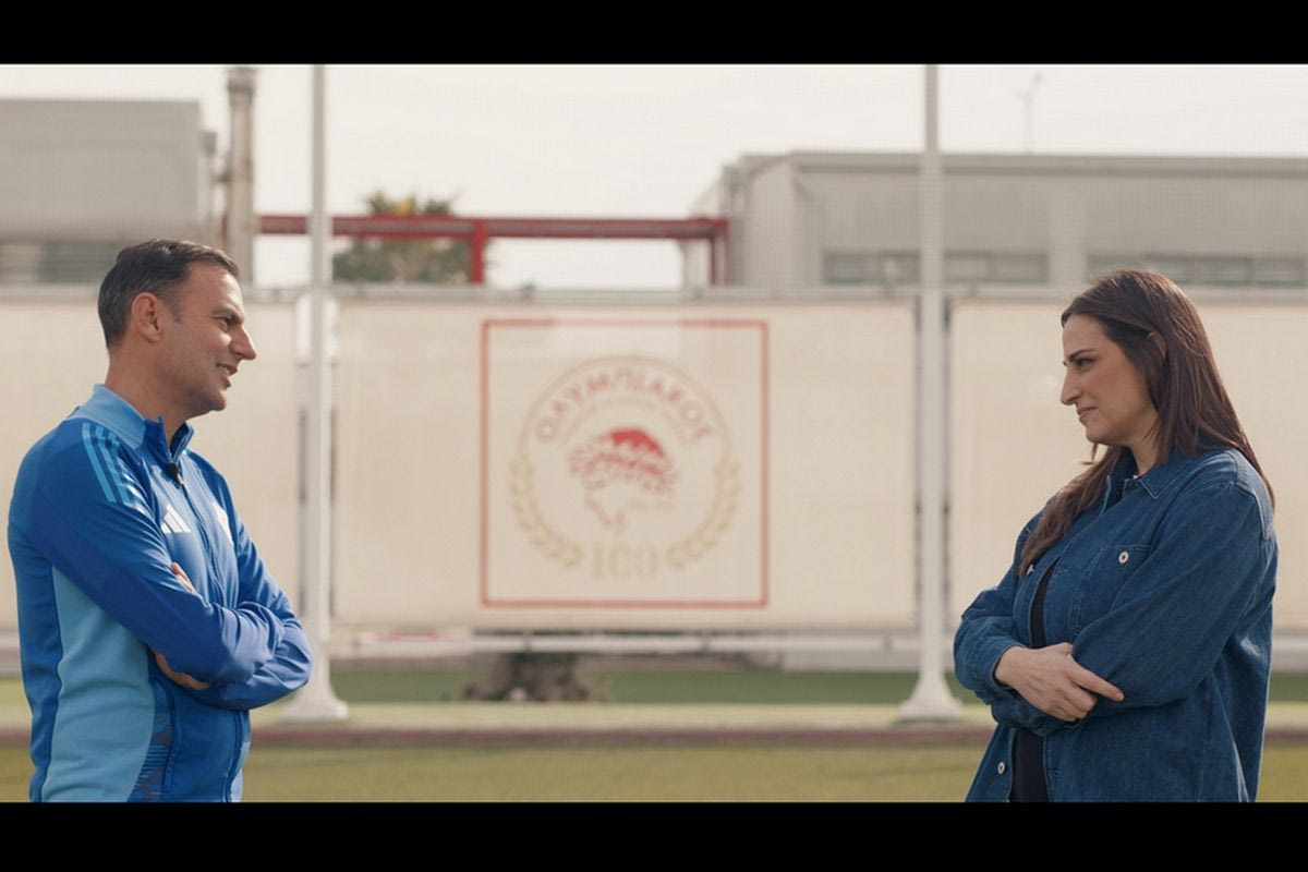Η Δώρα Αναγνωστοπούλου συνομιλεί με τον πρόεδρο του Ολυμπιακού, Βαγγέλη Μαρινάκη, τον άνθρωπο που έδωσε προοπτική στην ομάδα και καθοδήγησε τη μεγαλύτερη έως σήμερα ερυθρόλευκη διάκριση, την κατάκτηση του UEFA Conference League.