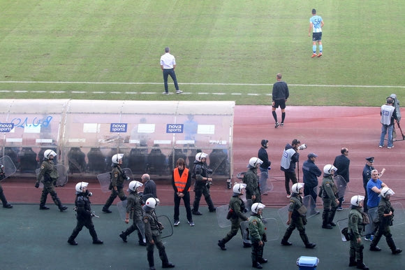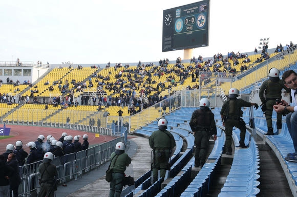 Στις εξέδρες προκλήθηκε μεγάλη ένταση, τόσο πολύ που η ΠΑΕ Ατρόμητος ζήτησε να διακοπεί το παιχνίδι, έστω προσωρινά, αν και ο Τίκας αποφάσισε να το συνεχίσει. Μάλιστα, αστυνομικές δυνάμεις βρέθηκαν στα επίσημα, καθώς οπαδοί των “κυανόλευκων” έφυγαν από το πέταλο και κατευθήνθηκαν προς τα εκεί, χτυπώντας τα προστατευτικά που χωρίζουν το πέταλο που βρίσκεται η θύρα 10, με την θύρα 4.