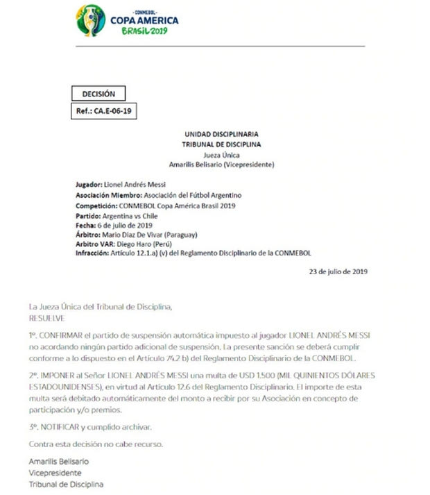 Σχεδόν τρεις εβδομάδες αργότερα, η CONMEBOL ανακοίνωσε πως ο Αργεντινός σούπερ σταρ τιμωρήθηκε με μία αγωνιστική, αλλά και πρόστιμο 1.400 ευρώ. Αυτό σημαίνει πως ο Μέσι θα απουσιάσει από το φιλικό με τη Χιλή(!) στις 6 Σεπτεμβρίου στο “United Airlines Field” του Λος Άντζελες.