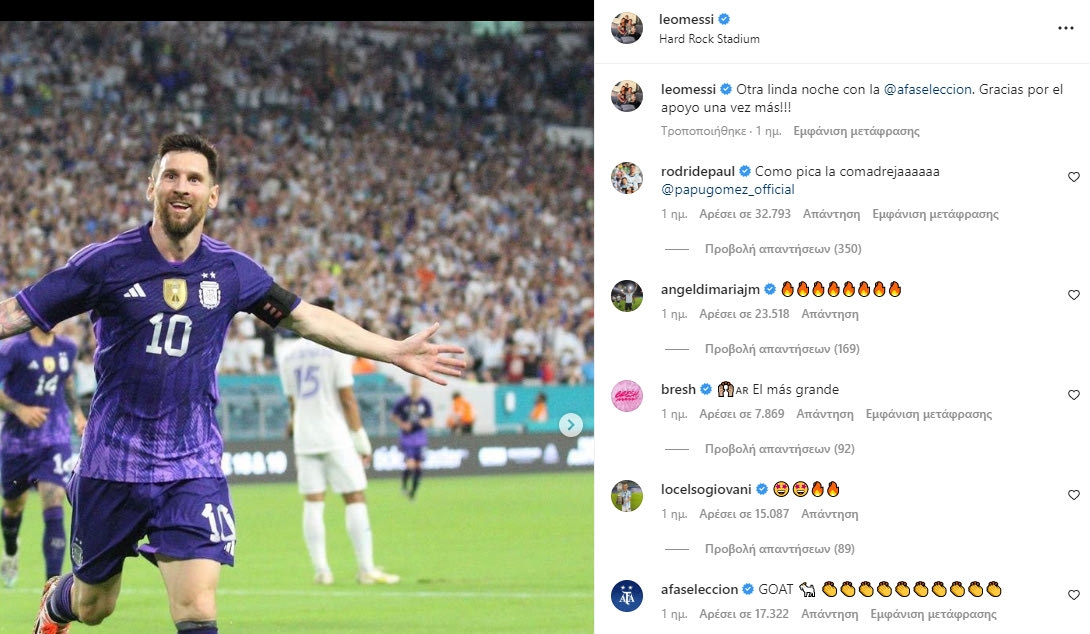 Ο Μέσι ανέβασε στο Instagram μία φωτογραφία του να πανηγυρίζει έπειτα από τη φιλική νίκη της “αλμπισελέστε” επί της Ονδούρας την Πέμπτη (όπου σημείωσε ένα υπέροχο γκολ) και ο Ροντρίγκο ντε Πολ σχολίασε: “Πώς τσιμπάει η νυφίτσα”. Ο μέσος της Ατλέτικο έκανε tag τον επιθετικό της Σεβίλλης, Αλεχάντρο Γκόμες, ο οποίος υπερθεμάτισε: “Η νυφίτσα είναι τρελή”.