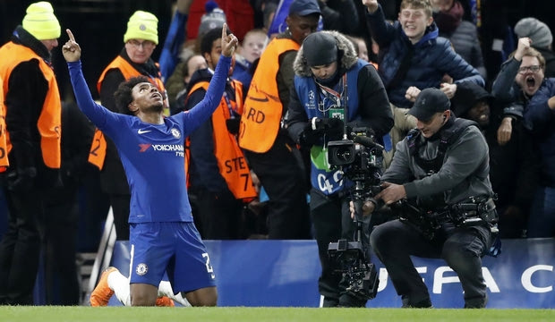 Chelsea's Willian celebrates after scoring the opening goal of his team during the Champions League, round of 16, first-leg soccer match between Chelsea and Barcelona at Stamford Bridge stadium, Tuesday, Feb. 20, 2018. (AP Photo/Frank Augstein)