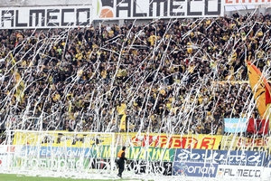 17:40 Οι συνδεσμίτες του Άρη άρχισαν να στολίζουν τα κάγκελα περιμετρικά του αγωνιστικού χώρου.