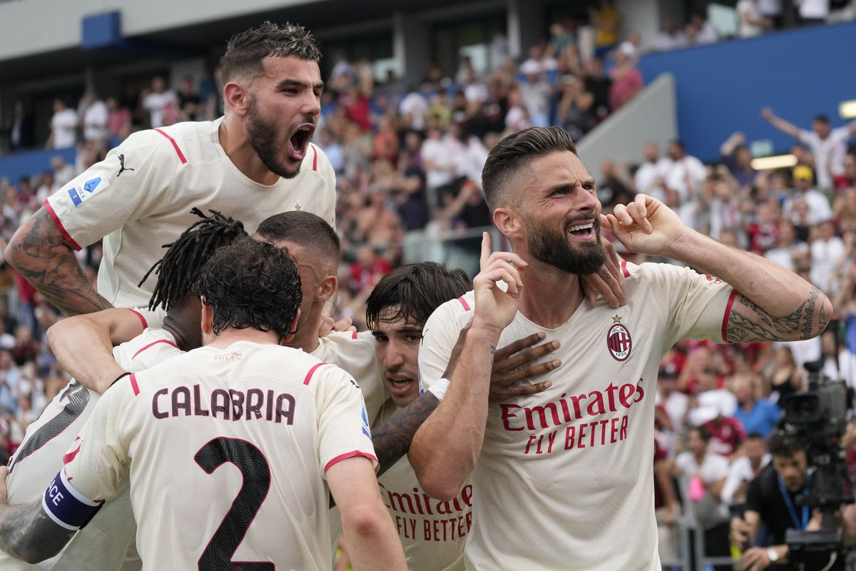 Ο Ολιβιέ Ζιρού πανηγυρίζει γκολ με τη φανέλα της Μίλαν απέναντι στην Σασουόλο | 22 Μαΐου 2022 @2022 Antonio Calanni/AP IMAGES
