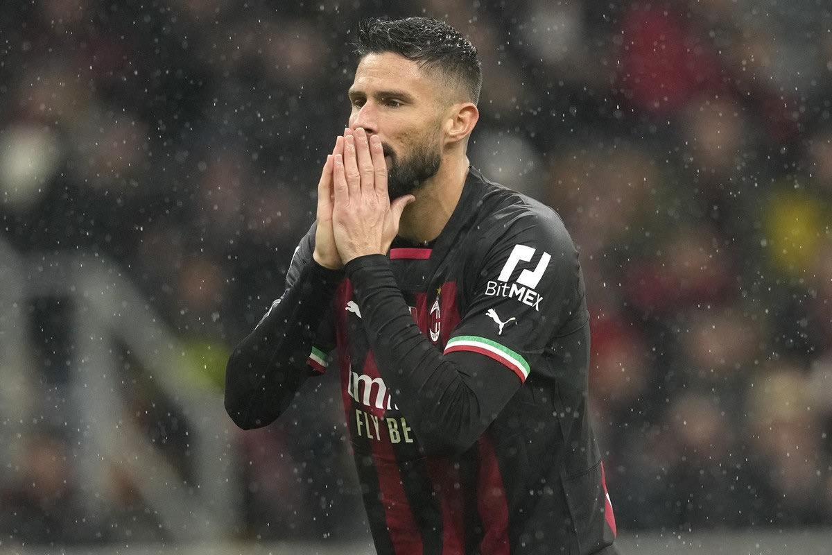 AC Milan's Olivier Giroud reacts during the Serie A soccer match between AC Milan and Roma at the San Siro stadium, in Milan, Italy, Sunday, Jan. 8, 2023. (AP Photo/Antonio Calanni)