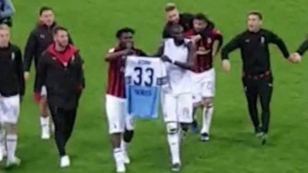 Οι παίκτες της Μίλαν, Τιεμουέ Μπακαγιοκό και Φρανκ Κεσιέ πανηγύρισαν τη νίκη (1-0) επί της Λάτσιο με τη φανέλα του αντιπάλου τους αμυντικού, Φραντσέσκο Ατσέρμπι, την οποία αντάλλαξαν μετά τη λήξη της αναμέτρησης.