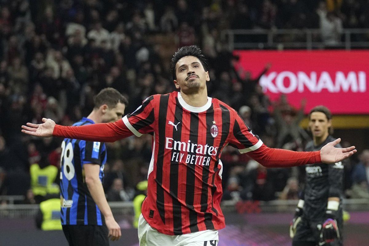 AC Milan's Tijjani Reijnders celebrates after scoring the opening goal during the Serie A soccer match between AC Milan and Inter Milan at the San Siro stadium