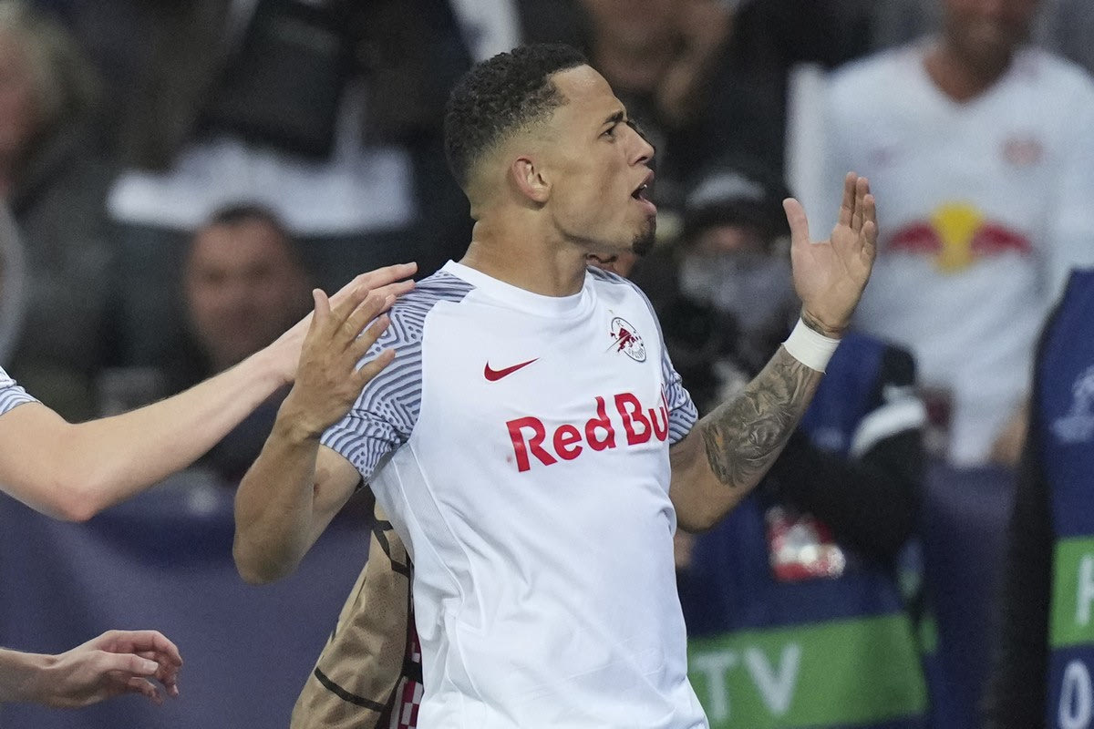 Ο Νοά Οκαφόρ πανηγυρίζει γκολ με τη φανέλα της Ζάλτσμπουργκ απέναντι στην Βόλφσμπουργκ για το Champions League | 20 Οκτωβρίου 2021 @2021 Matthias Schrader/AP IMAGES