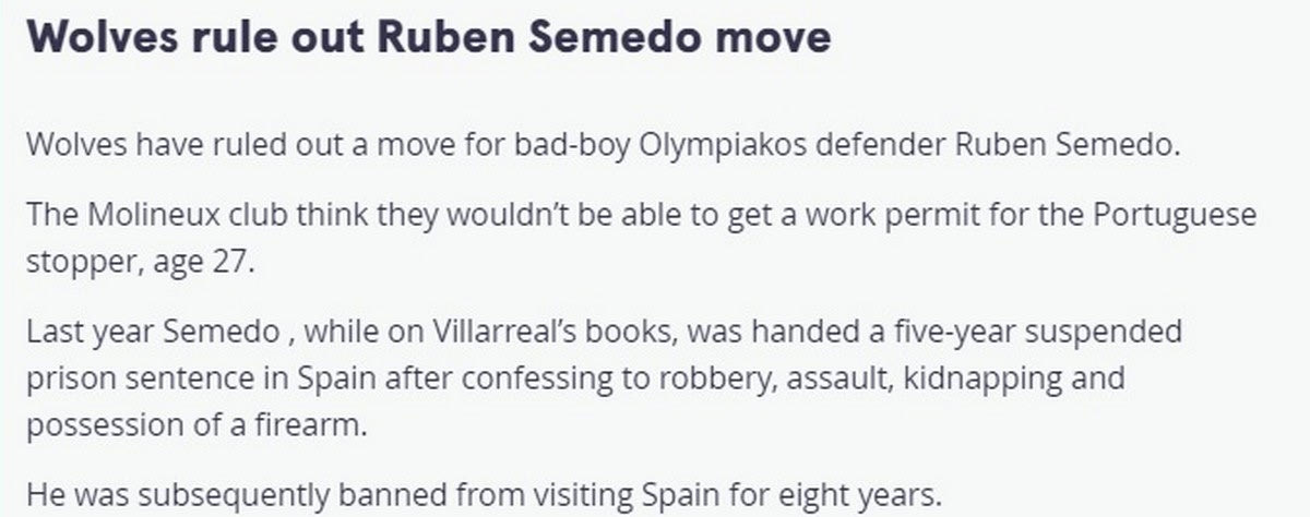 Σύμφωνα με δημοσίευμα της Mirror, η Γουλβς δεν θα κινηθεί για την απόκτηση του Ρούμπεν Σεμέδο, καθώς λόγω των δικαστικών μπλεξιμάτων δεν θα μπορεί να βγάλει την visa εργασίας.
