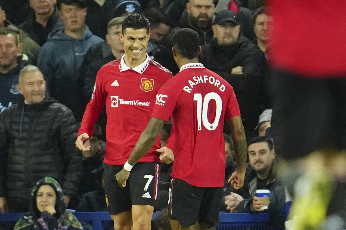 Ο Κριστιάνο Ρονάλντο πανηγυρίζει μαζί με τον Μάρκους Ράσφορντ γκολ της Μάντσεστερ Γιουνάιτεντ κόντρα στην Έβερτον | 9 Οκτωβρίου 2022 © 2022 Jon Super/AP IMAGES