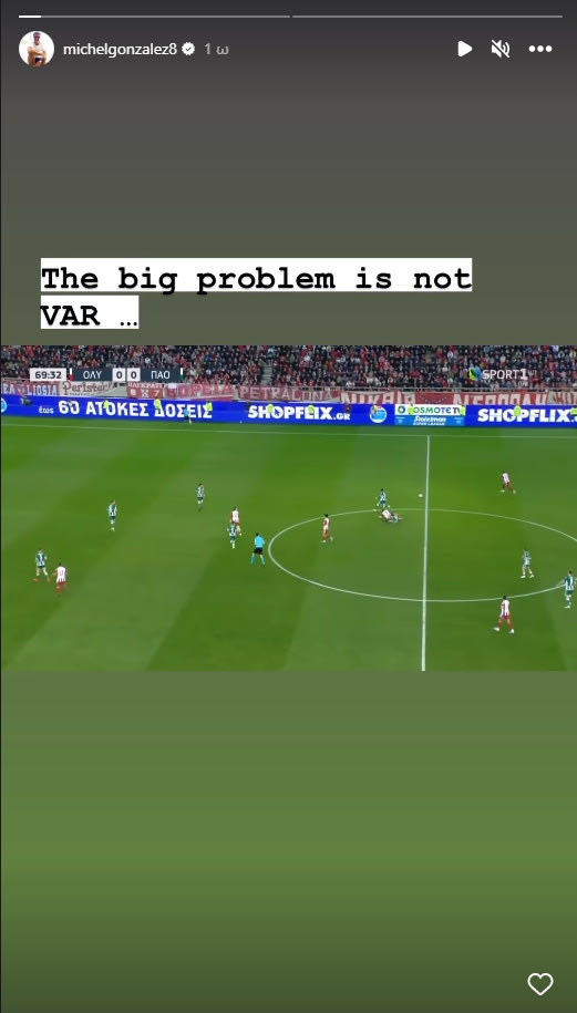 Ο Μίτσελ με story στον λογαριασμό του στο Instagram ανέβασε δύο φάσεις από το ντέρμπι με τον Παναθηναϊκό στο Γεώργιος Καραϊσκάκης και έγραψε ότι το μεγάλο πρόβλημα δεν είναι το VAR,