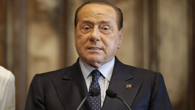 Forza Italia party leader Silvio Berlusconi meets reporters after meeting designate premier Giuseppe Conte at Rome's Low Chamber, Friday, Aug. 30, 2019. (AP Photo/Alessandra Tarantino)