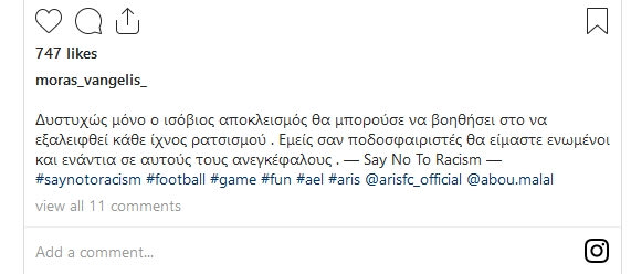 “Δυστυχώς μόνο ο ισόβιος αποκλεισμός θα μπορούσε να βοηθήσει στο να εξαλειφθεί κάθε ίχνος ρατσισμού . Εμείς σαν ποδοσφαιριστές θα είμαστε ενωμένοι και ενάντια σε αυτούς τους ανεγκέφαλους . — Say No To Racism”, έγραψε ο Μόρας στο Instagram.