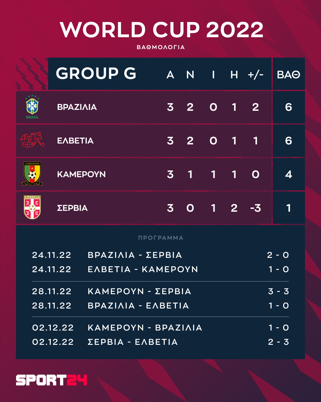 Ολοκληρώθηκε η τρίτη αγωνιστική του 7ου ομίλου του Μουντιάλ. Η Βραζιλία παρά την ήττα από το Καμερούν τερμάτισε στην πρώτη θέση, ενώ η Ελβετία νίκησε 3-2 την Σερβία και βγήκε δεύτερη.