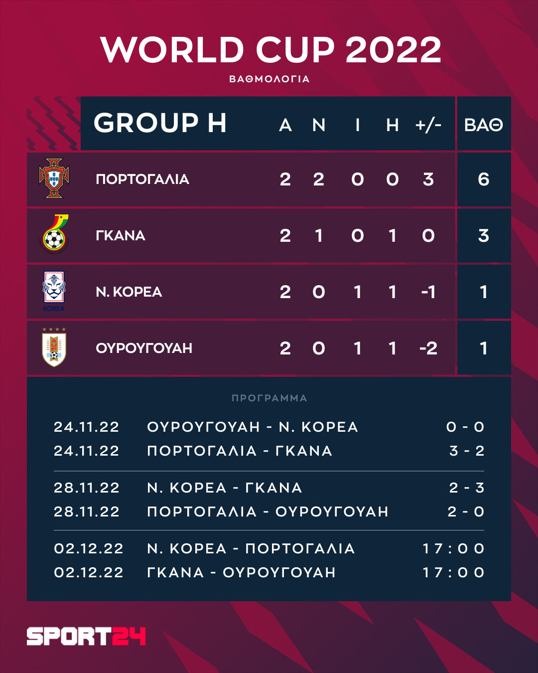 - 02/12, 17:00, Νότια Κορέα – Πορτογαλία (Education City Stadium) ΑΝΤ1 / ΑΝΤ1+