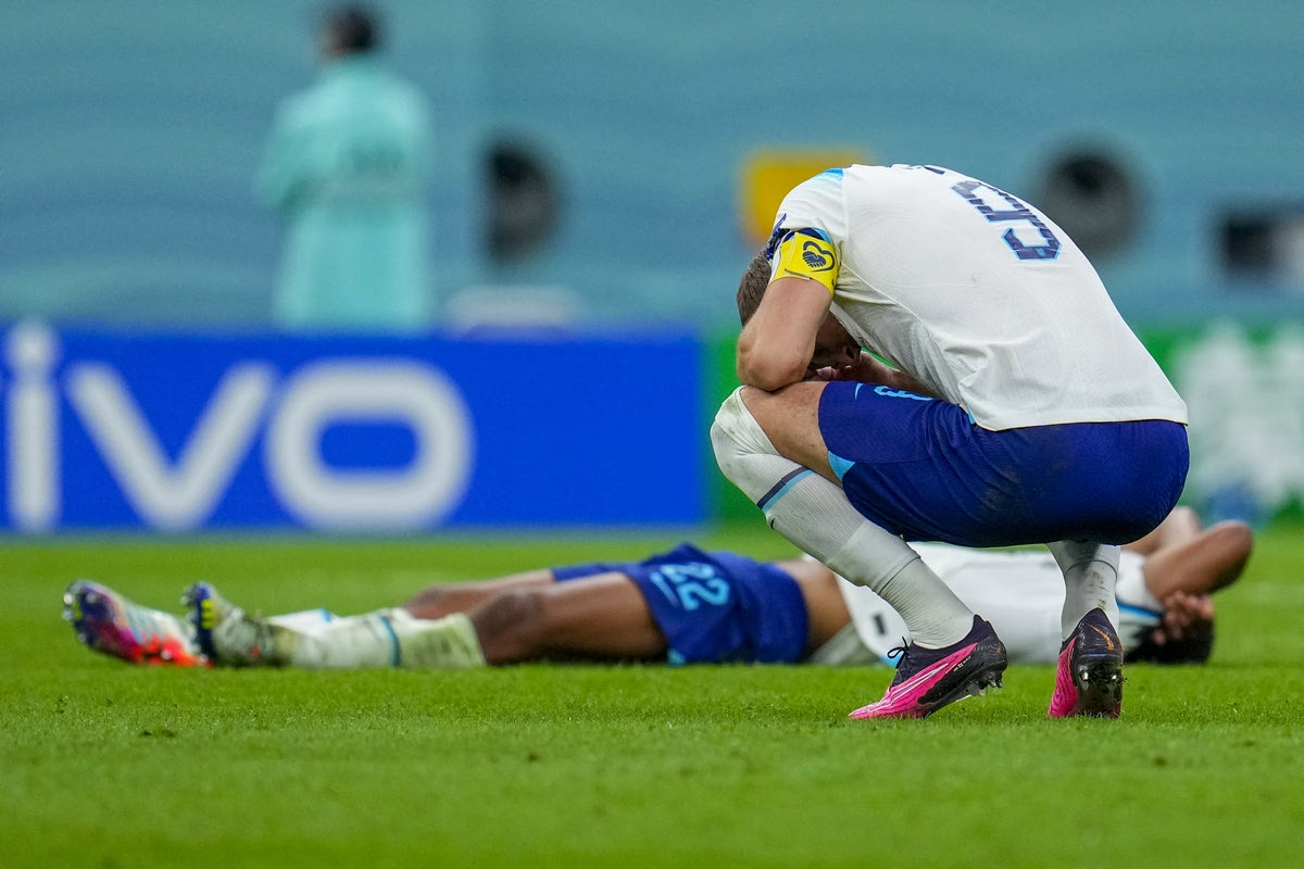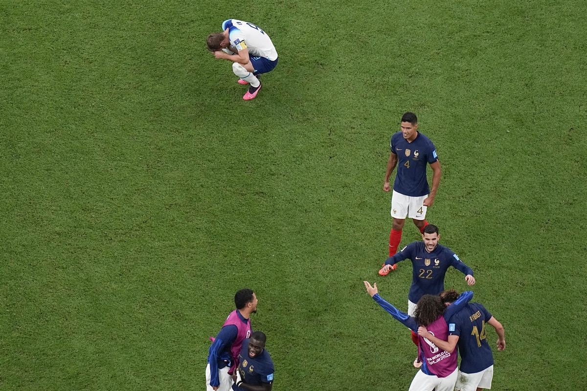 Ο φωτογραφικός φακός συνέλαβε τον απογοητευμένο Χάρι Κέιν να έχει λυγίσει μετά τον αποκλεισμό της Αγγλίας, την ώρα που δίπλα του οι Γάλλοι πανηγυρίζουν.