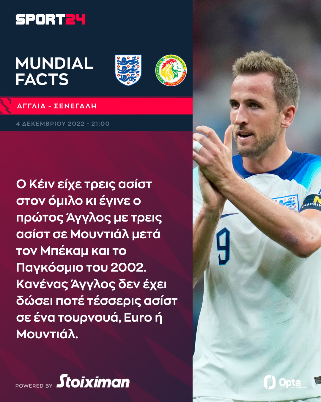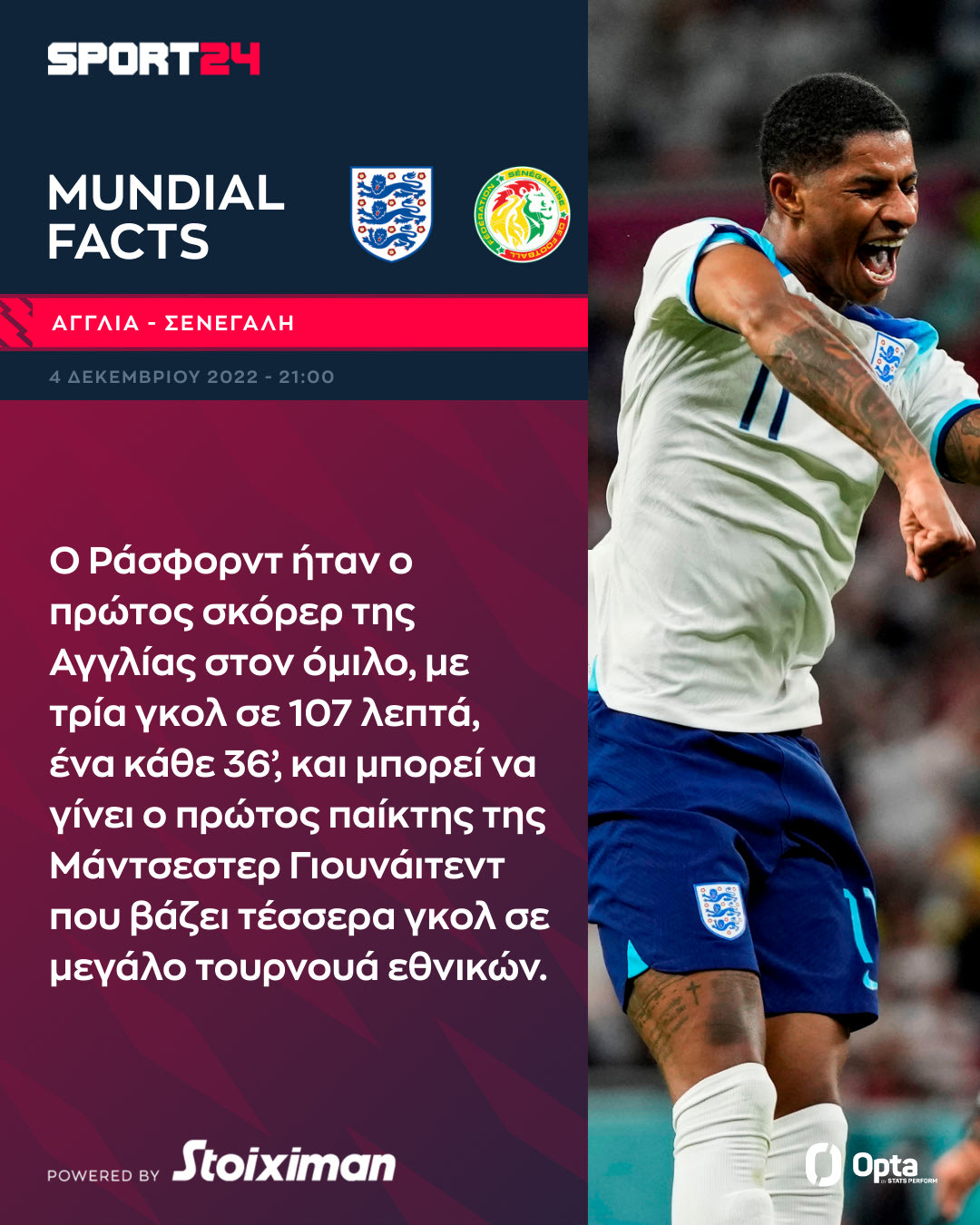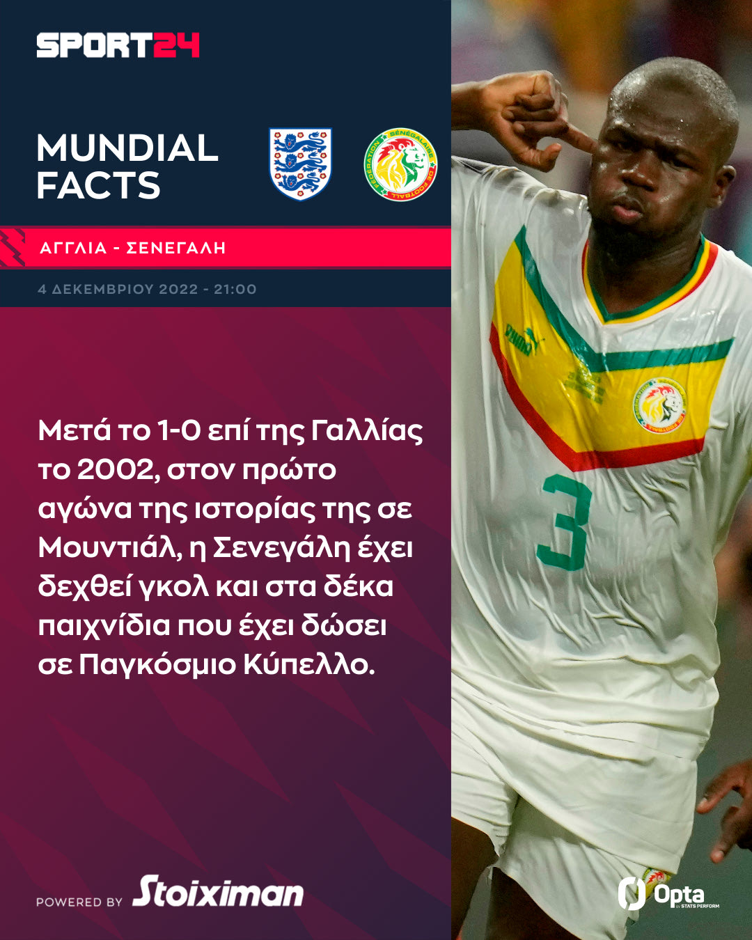 Αγγλία και Σενεγάλη μονομαχούν στο Al Bayt Stadium (04/12, 21:00, ΑΝΤ1 και Live SPORT24) στο πλαίσιο της φάσης των 16 του Μουντιάλ 2022. Δείτε ορισμένα χρήσιμα στοιχεία με τη βοήθεια της Opta.