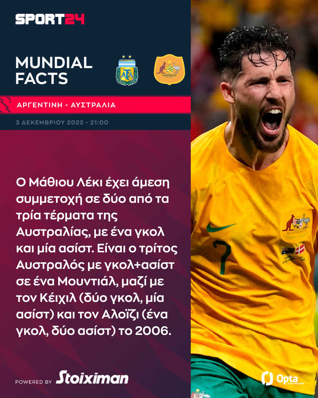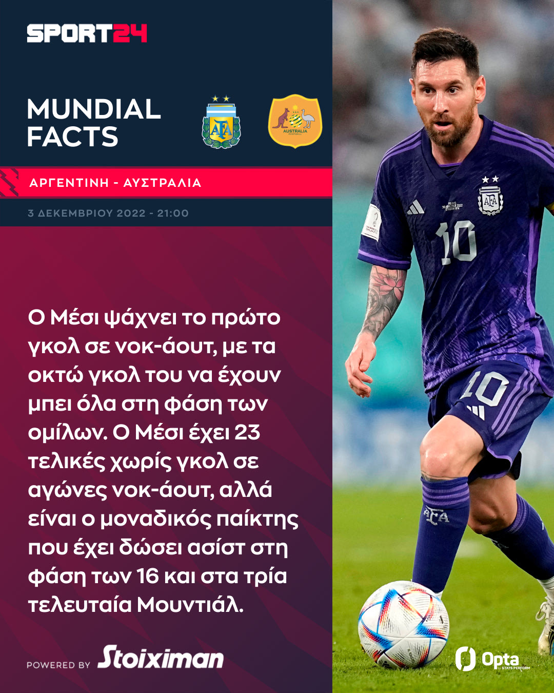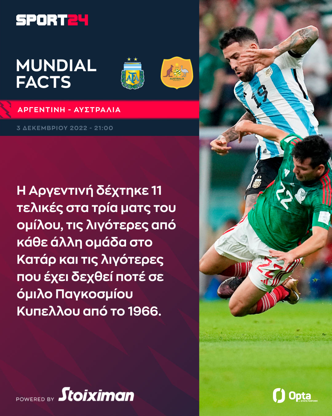 Αργεντινή και Αυστραλία (03/12, 21:00, ΑΝΤ1 και Live SPORT24) δίνουν μάχη για την πρόκριση στους "8" του Μουντιάλ 2022. Δείτε ορισμένα χρήσιμα facts της αναμέτρησης.