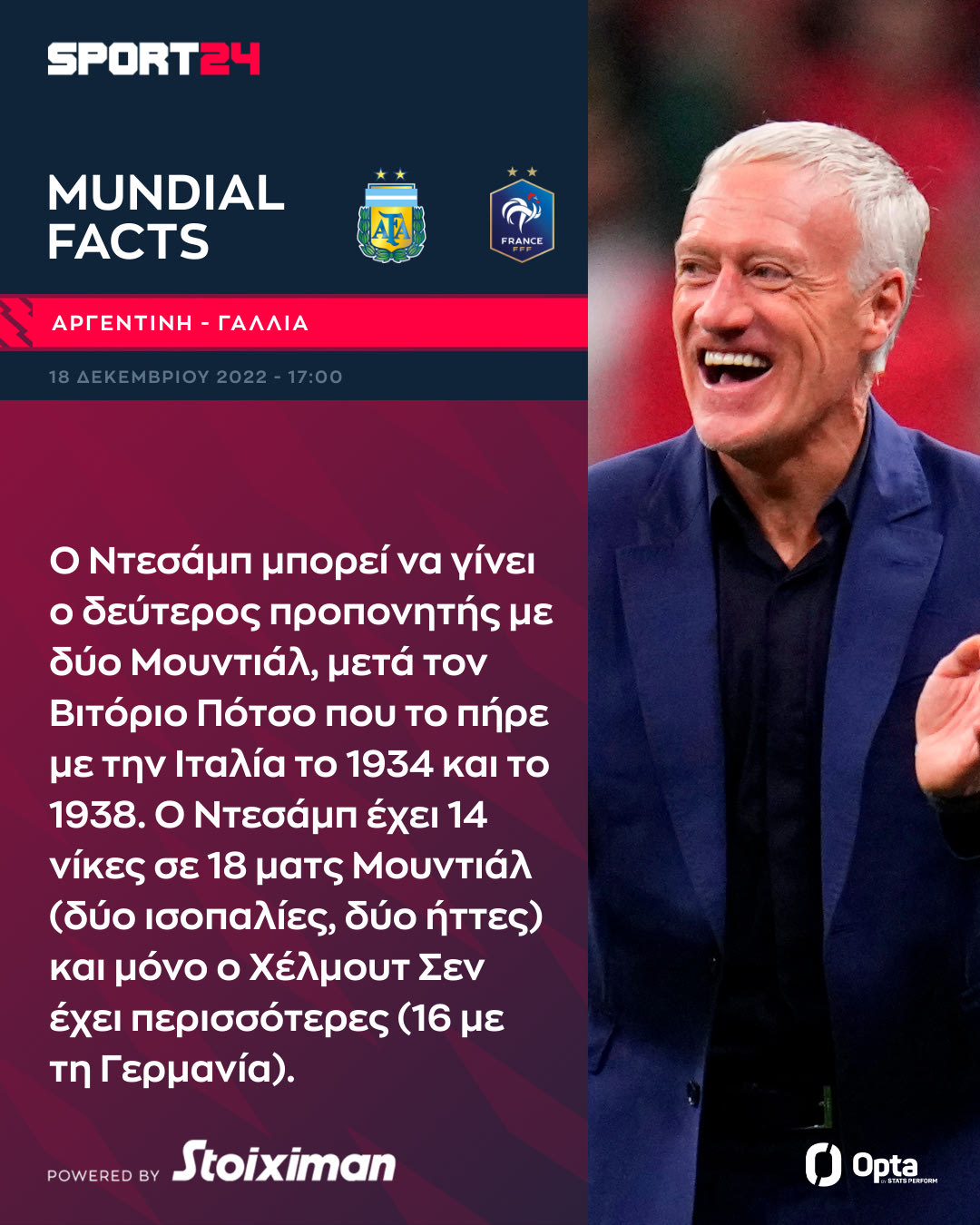 Ο Ντεσάμπ μπορεί να γίνει ο δεύτερος προπονητής με δύο Μουντιάλ, μετά τον Βιτόριο Πότσο που το πήρε με την Ιταλία το 1934 και το 1938. Ο Ντεσάμπ έχει 14 νίκες σε 18 ματς Μουντιάλ (δύο ισοπαλίες, δύο ήττες) και μόνο ο Χέλμουτ Σεν έχει περισσότερες (16 με τη Γερμανία).