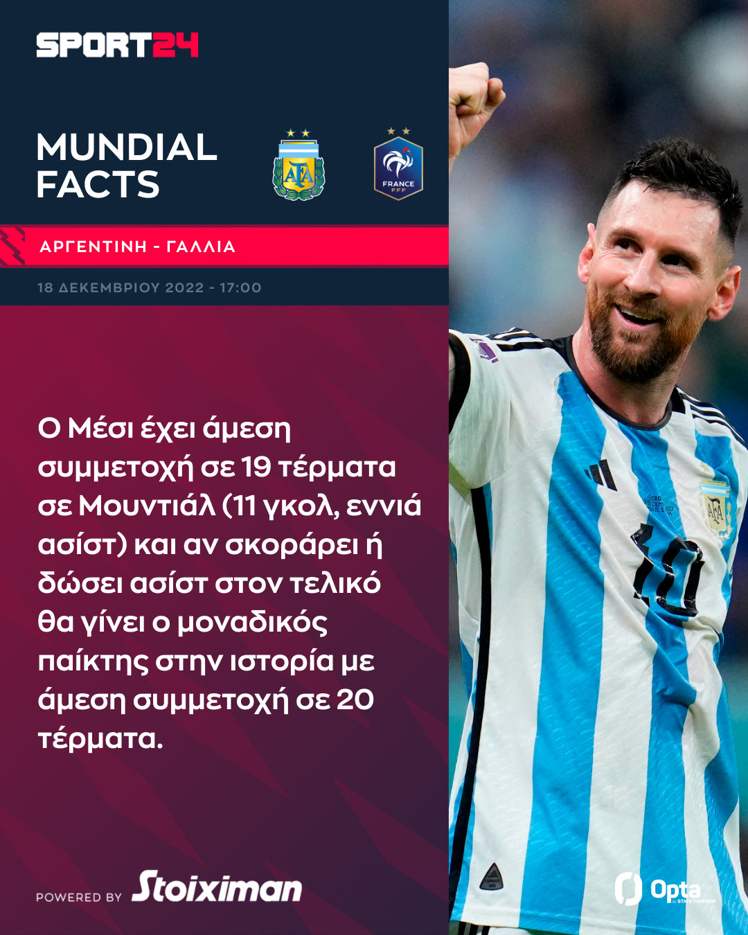 Ο Μέσι έχει άμεση συμμετοχή σε 19 τέρματα σε Μουντιάλ (11 γκολ, εννιά ασίστ) και αν σκοράρει ή δώσει ασίστ στον τελικό θα γίνει ο μοναδικός παίκτης στην ιστορία με άμεση συμμετοχή σε 20 τέρματα.