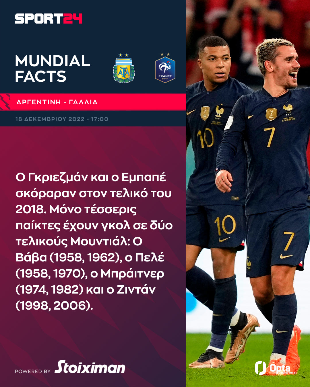 Ο Γκριεζμάν και ο Εμπαπέ σκόραραν στον τελικό του 2018. Μόνο τέσσερις παίκτες έχουν γκολ σε δύο τελικούς Μουντιάλ: Ο Βάβα (1958, 1962), ο Πελέ (1958, 1970), ο Μπράιτνερ (1974, 1982) και ο Ζιντάν (1998, 2006).
