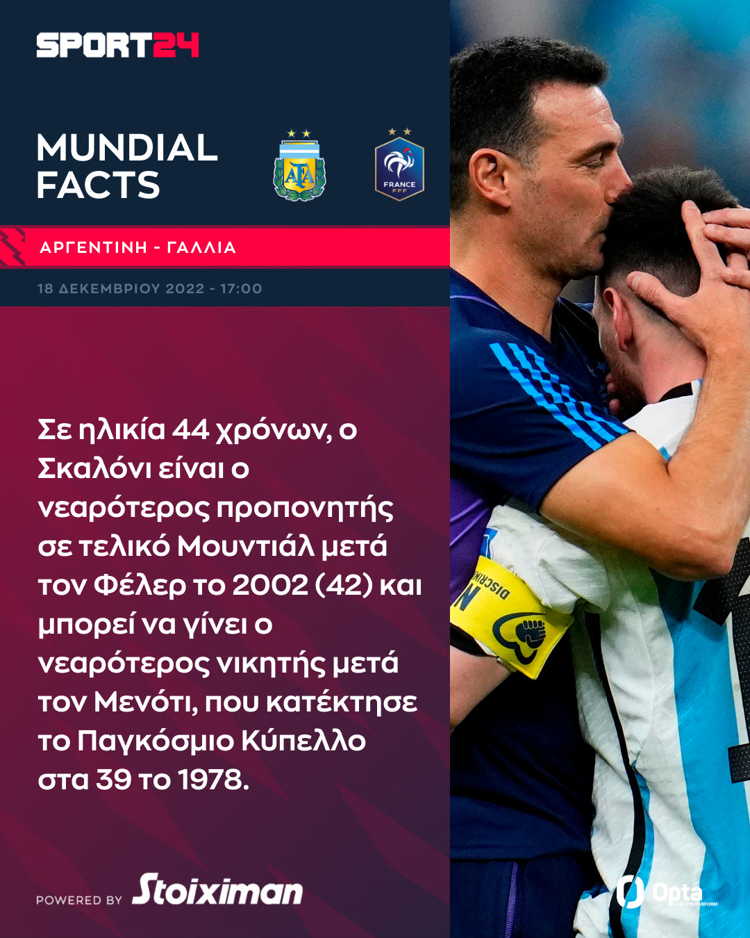 Σε ηλικία 44 χρόνων, ο Σκαλόνι είναι ο νεαρότερος προπονητής σε τελικό Μουντιάλ μετά τον Φέλερ το 2002 (42) και μπορεί να γίνει ο νεαρότερος νικητής μετά τον Μενότι, που κατέκτησε το Παγκόσμιο Κύπελλο στα 39 το 1978.