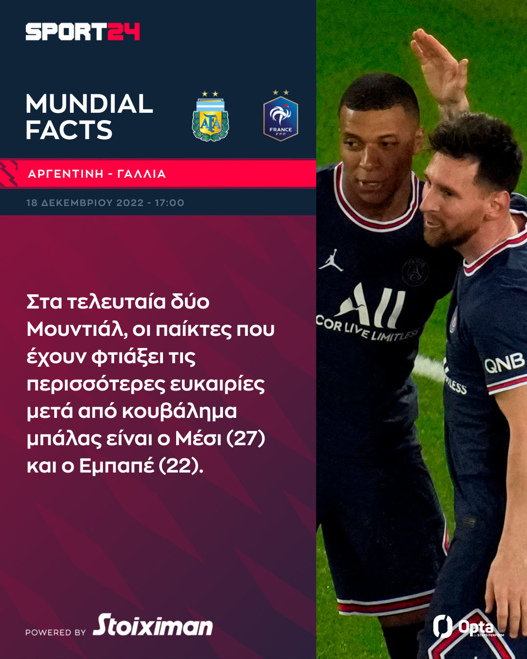 Αυτή θα είναι η τέταρτη συνάντηση των δύο ομάδων σε Μουντιάλ, με τη Αργεντινή να έχει δύο νίκες και τη Γαλλία να επικρατεί με 4-3 στον αγώνα στους 16 στο Παγκόσμιο το 2018.