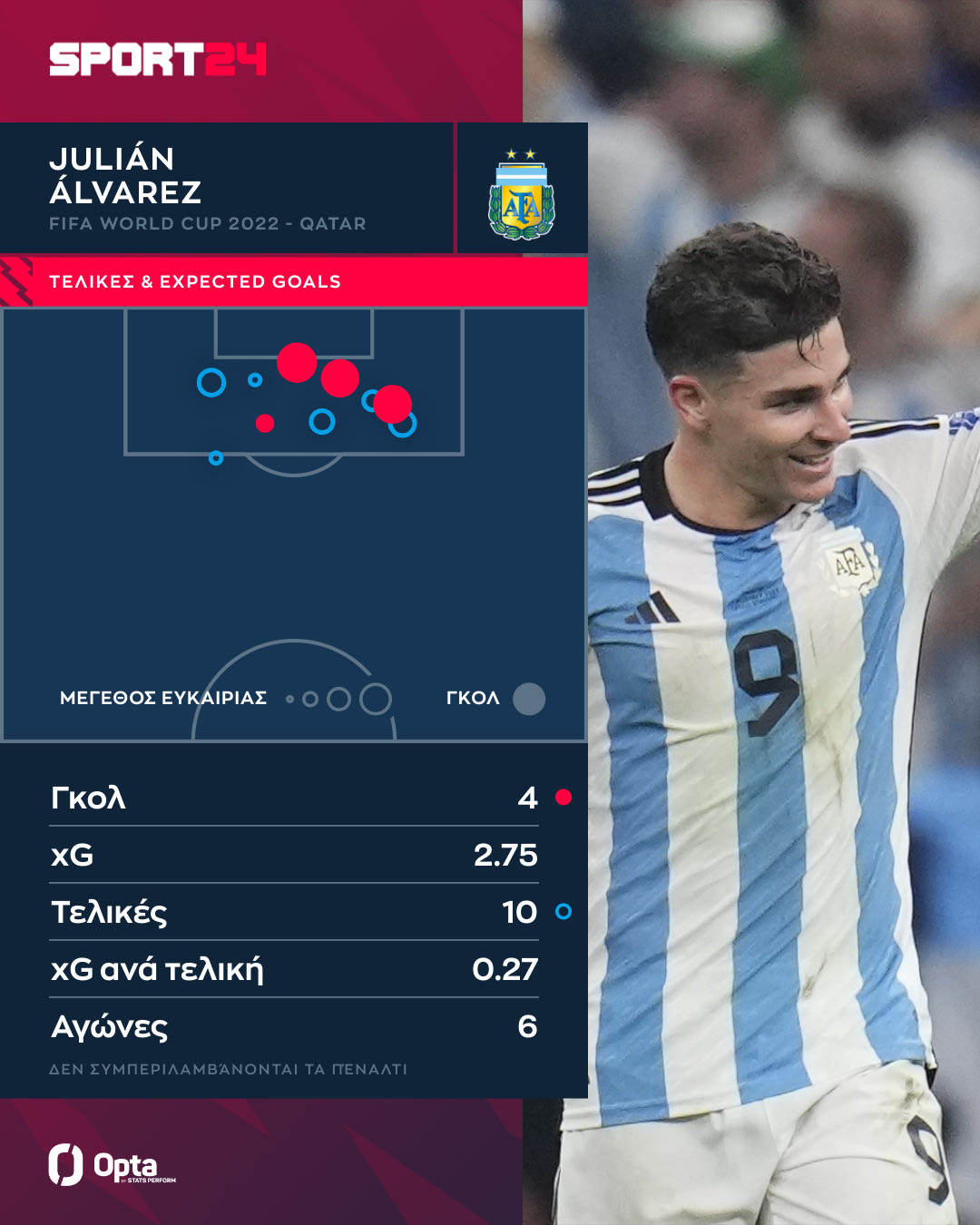 Με τα δύο γκολ κόντρα στην Κροατία θύμισε τον… Πελέ. Πώς γίνεται αυτό; Ο Άλβαρες έγινε ο νεαρότερος ποδοσφαιριστής (22 ετών και 316 ημερών) που σκοράρει δύο γκολ σε ημιτελικό ή τελικό Παγκοσμίου Κυπέλλου από το 1958, όταν το είχε πετύχει ο Πελέ (17 ετών και 249 ημερών).