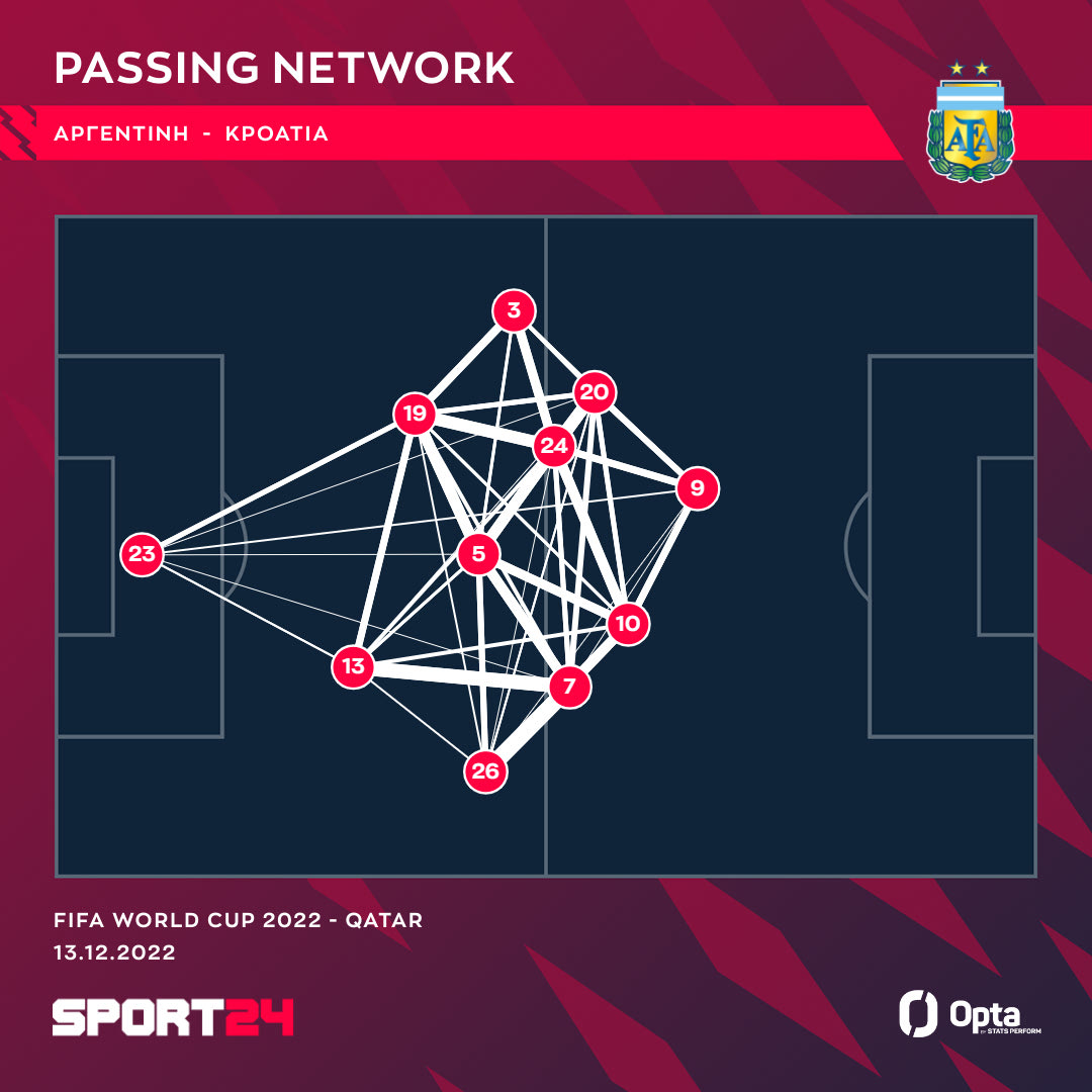 Στο παρακάτω γράφημα της Opta/Stats Perform μπορείτε να δείτε τον χώρο δράσης και το δίκτυο μεταβιβάσεων των ποδοσφαιριστών της αλμπισελέστε.