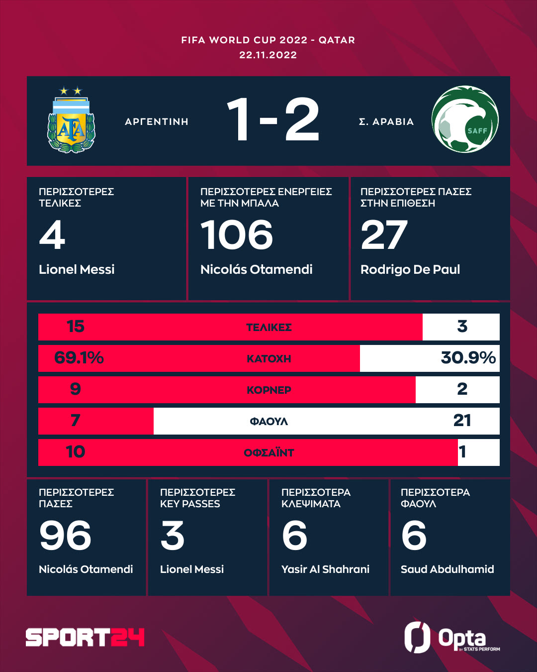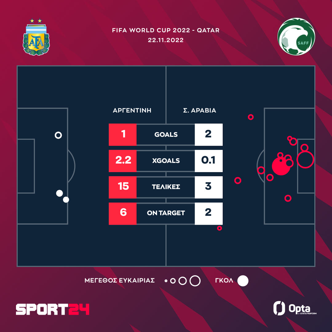 Η Αργεντινή προηγήθηκε στο σκορ στο 10ο λεπτό με πέναλτι του Λιονέλ Μέσι. Στο πρώτο μέρος δεν μέτρησαν μάλιστα και τρία γκολ της αλμπισελέστε. Στο δεύτερο μέρος η Σαουδική Αραβία έκανε την απόλυτη ανατροπή. Ο Αλ Σέχρι στο 48′ ισοφάρισε και ο Αλ Νταουσάρι έβαλε μπροστά την ομάδα του.