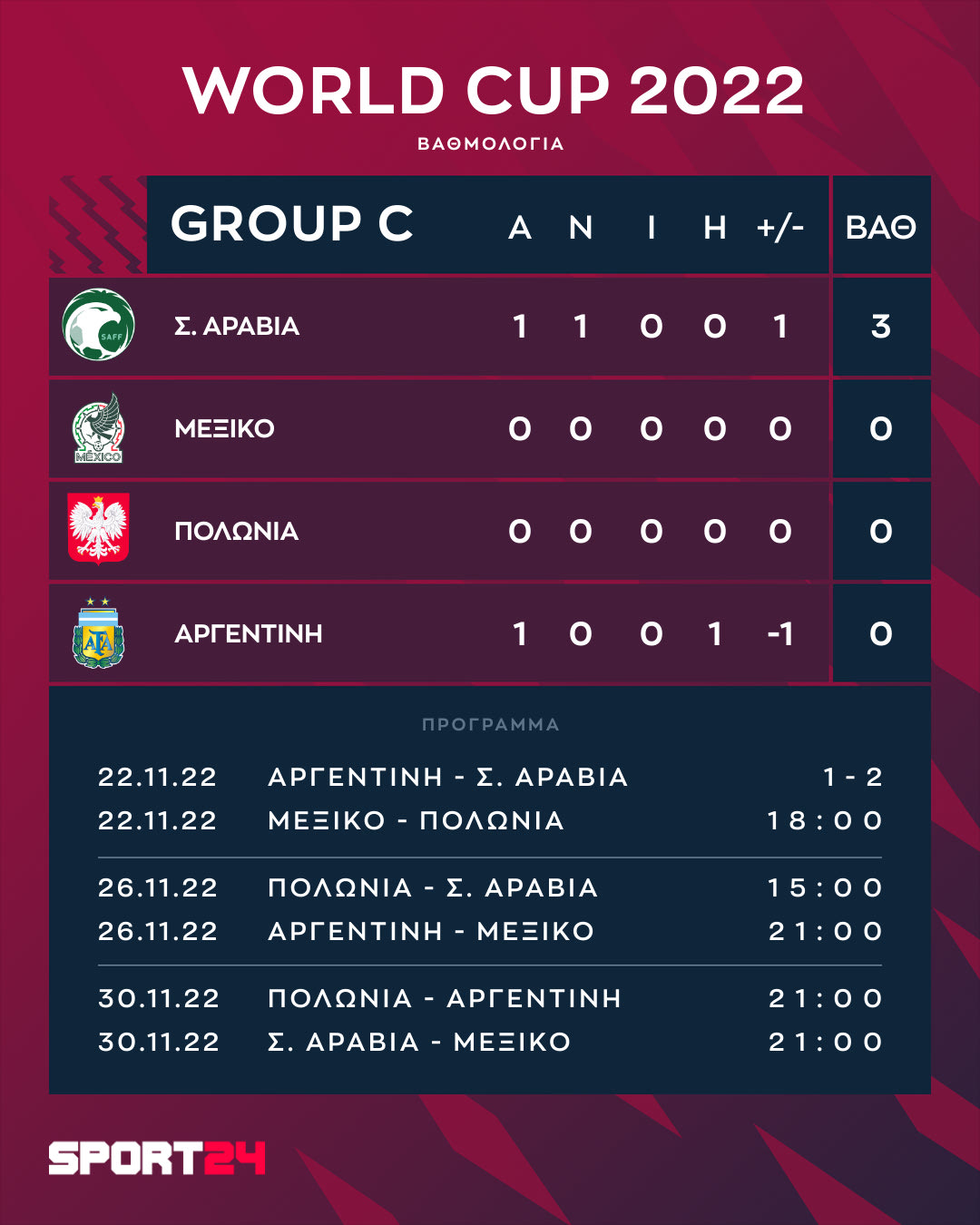 Η αλμπισελέστε έμεινε στους μηδέν βαθμούς και πλέον βρίσκεται σε δύσκολη θέση, καθώς ακολουθούν δύο δύσκολα παιχνίδι κόντρα σε Μεξικό (26/11, 21:00) και Πολωνία (30/11, 21:00). Από την άλλη η Σαουδική Αραβία έχει δικαίωμα στο όνειρο. Ακολουθούν οι αγώνες με Πολωνία (26/11, 15:00) και Μεξικό (30/11, 21:00).