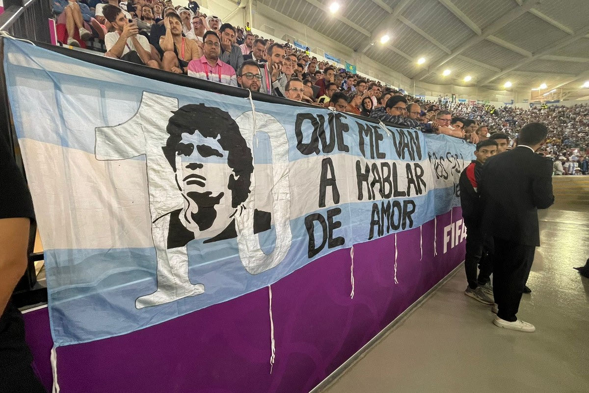 Στο ματς απέναντι στην Αυστραλία οπαδοί της Αργεντινής κρέμασαν ένα εντυπωσιακό πανό στις κερκίδες του Ahmed bin Ali. Συγκεκριμένα, δίπλα από το πρόσωπό του Ντιέγκο υπήρχαν οι στίχοι του τραγουδιού “Que me van a hablar de amor” δηλαδή “Τι να μου πείτε για αγάπη”.