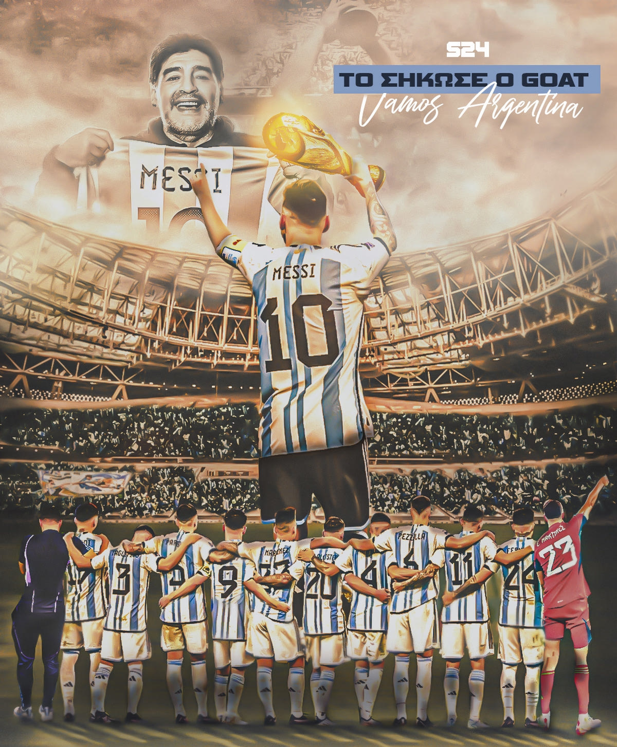 Η Αργεντινή είναι Παγκόσμια Πρωταθλήτρια από το βράδυ της Κυριακής και το SPORT24 είχε έτοιμάσει ένα τρομερό εικαστικό με τον Λιονέλ Μέσι να σηκώνει το Παγκόσμιο Κύπελλο και τον Ντιέγκο Μαραντόνα να χαμογελά στον ουρανό.