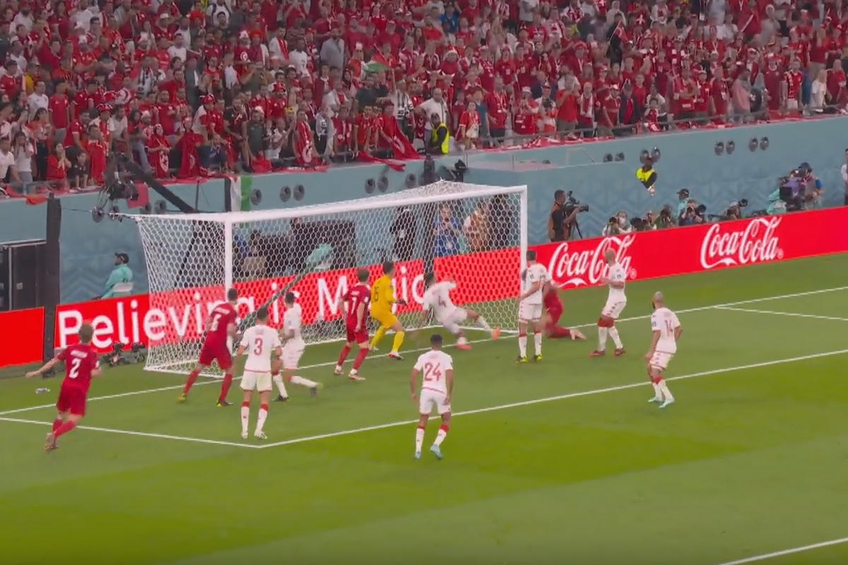 Η Δανία άγγιξε το γκολ στο 70ο λεπτό της αναμέτρησης με την Τυνησία με τον Κορνέλιους, με τον φορ των Σκανδιναβών να στέλνει όμως τη μπάλα στο αριστερό δοκάρι με κεφαλιά μέσα από τη μικρή περιοχή.