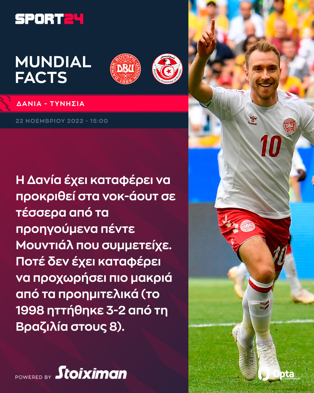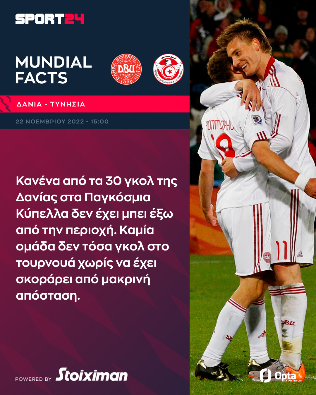 Η Δανία και η Τυνησία (22/11, 15:00, ANT1+, LIVE SPORT24) διασταυρώνουν τα ξίφη τους στο Education City Stadium για την 1η αγωνιστική του τετάρτου ομίλου του Παγκοσμίου Κυπέλλου. Δείτε ενδιαφέροντα facts για την αναμέτρηση.
