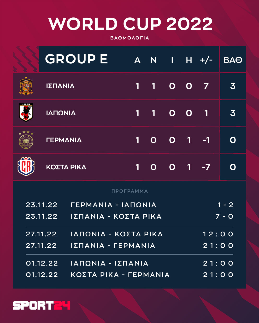 - 27/11, 12:00 Ιαπωνία – Κόστα Ρίκα, (Stadium Ahmed bin Ali), ΑΝΤ1 / ΑΝΤ1+