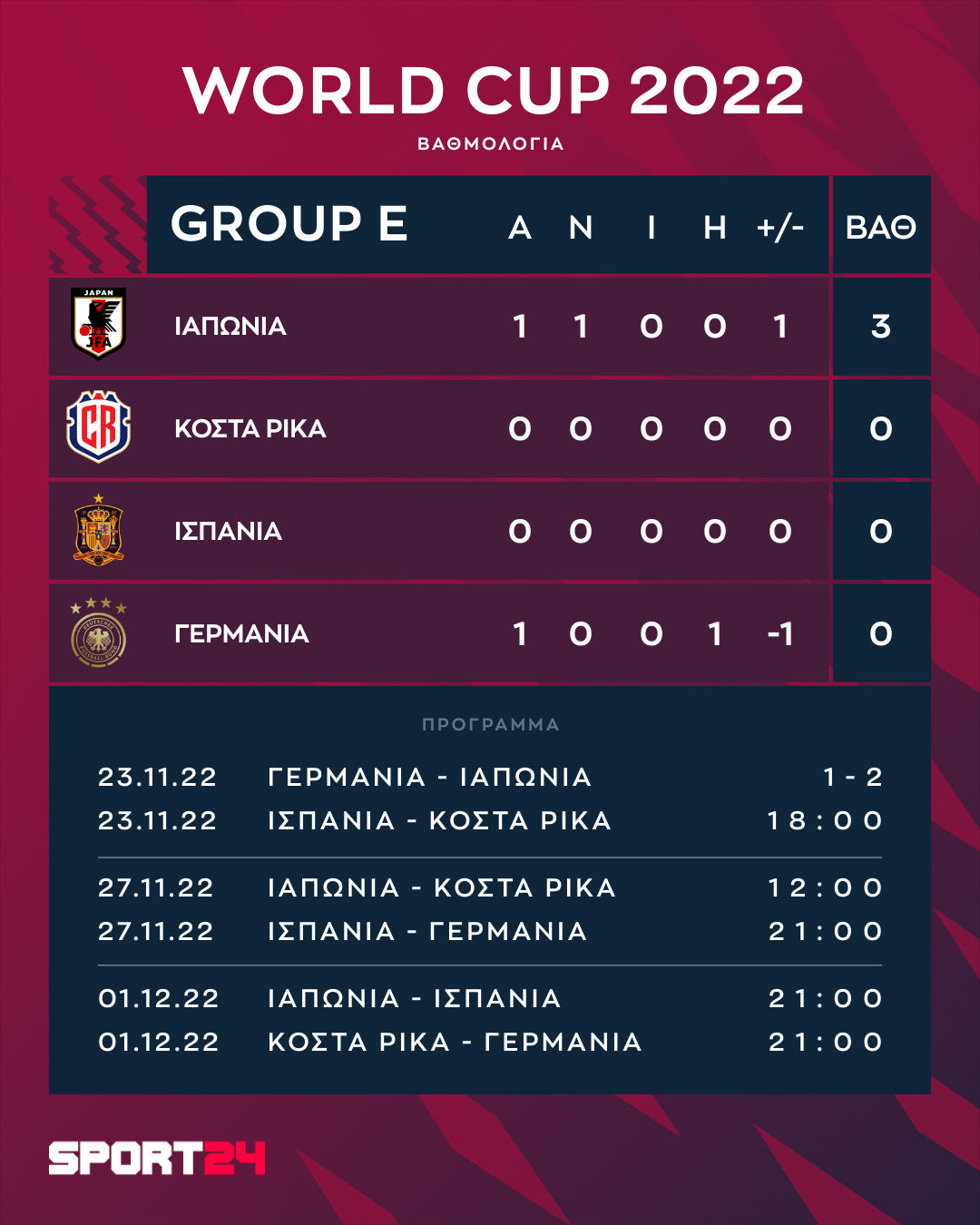 - 27/11, 12:00 Ιαπωνία – Κόστα Ρίκα, (Stadium Ahmed bin Ali), ΑΝΤ1 / ΑΝΤ1+