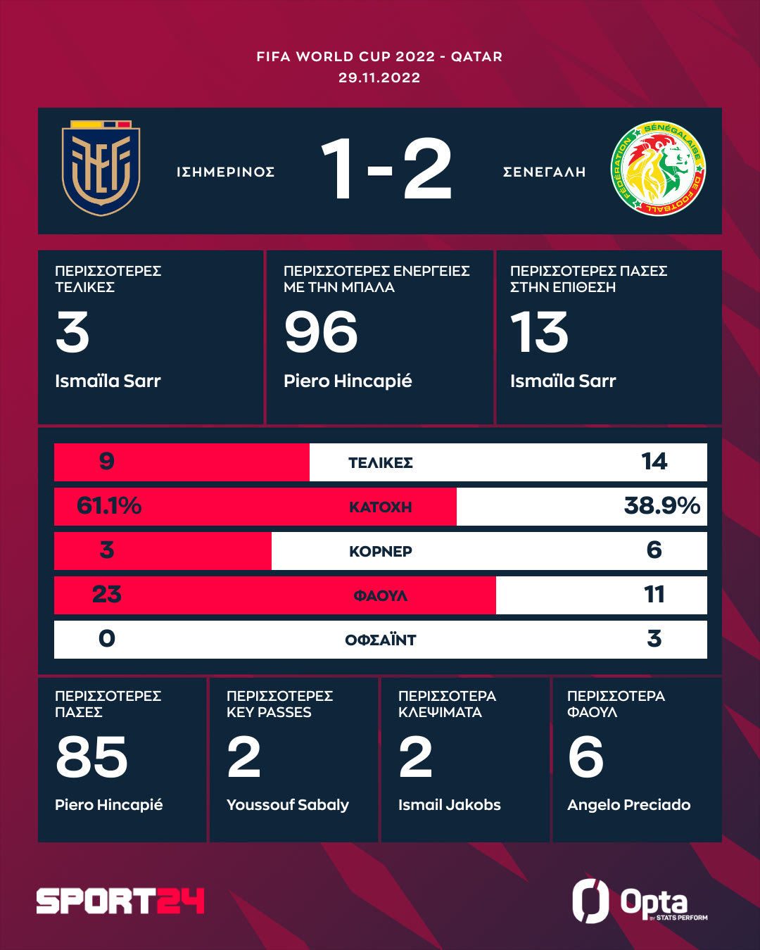 Η Σενεγάλη επιβλήθηκε του Εκουαδόρ με 2-1 χάρη στα γκολ των Ισμαϊλά Σαρ και Καλιντού Κουλιμπαλί και πήρε μια δίκαιη νίκη και συνάμα πρόκριση στα νοκ άουτ του Μουντιάλ 2022, αφήνοντας εκτός συνέχειας την αντίπαλό της.