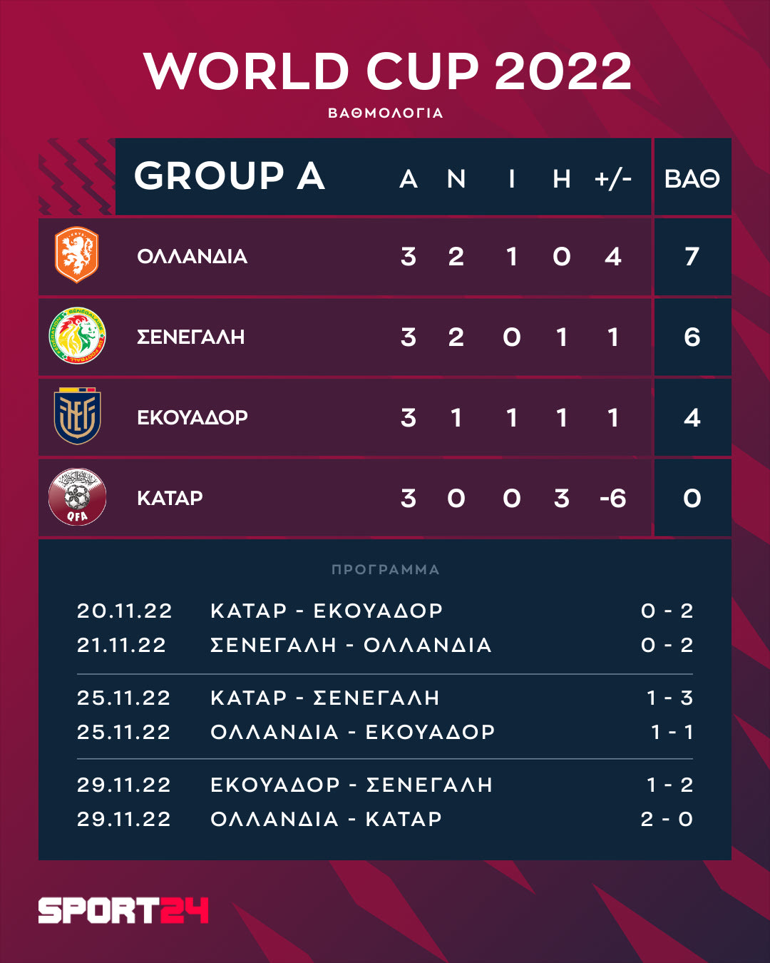 Η Σενεγάλη έκανε την ανατροπή στη βαθμολογία του 1ου ομίλου του Μουντιάλ 2022 την τελευταία αγωνιστική και με τη νίκη 2-1 επί του Εκουαδόρ κατέλαβε τη 2η θέση, πίσω από την Ολλανδία.