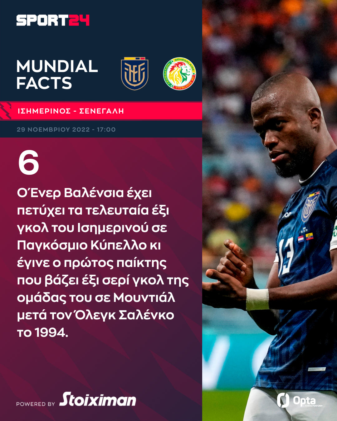 Το Εκουαδόρ αντιμετωπίζει τη Σενεγάλη σε μία μεγάλη μάχη για την πρόκριση στους 16 του Παγκοσμίου Κυπέλλου. Δείτε ορισμένα χρήσιμα facts με τη βοήθεια της Opta.
