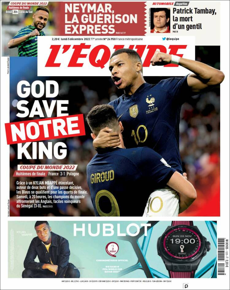 Ο Κιλιάν Εμπαπέ ήταν ο μεγάλος πρωταγωνιστής της Γαλλίας στο 3-0 επί της Πολωνίας και η Equipe τον συμπεριέλαβε στο πρωτοσέλιδο της Δευτέρας (5/12) με τίτλο "God Save Notre King", στέλνοντας ξεκάθαρο μήνυμα στην Αγγλία.