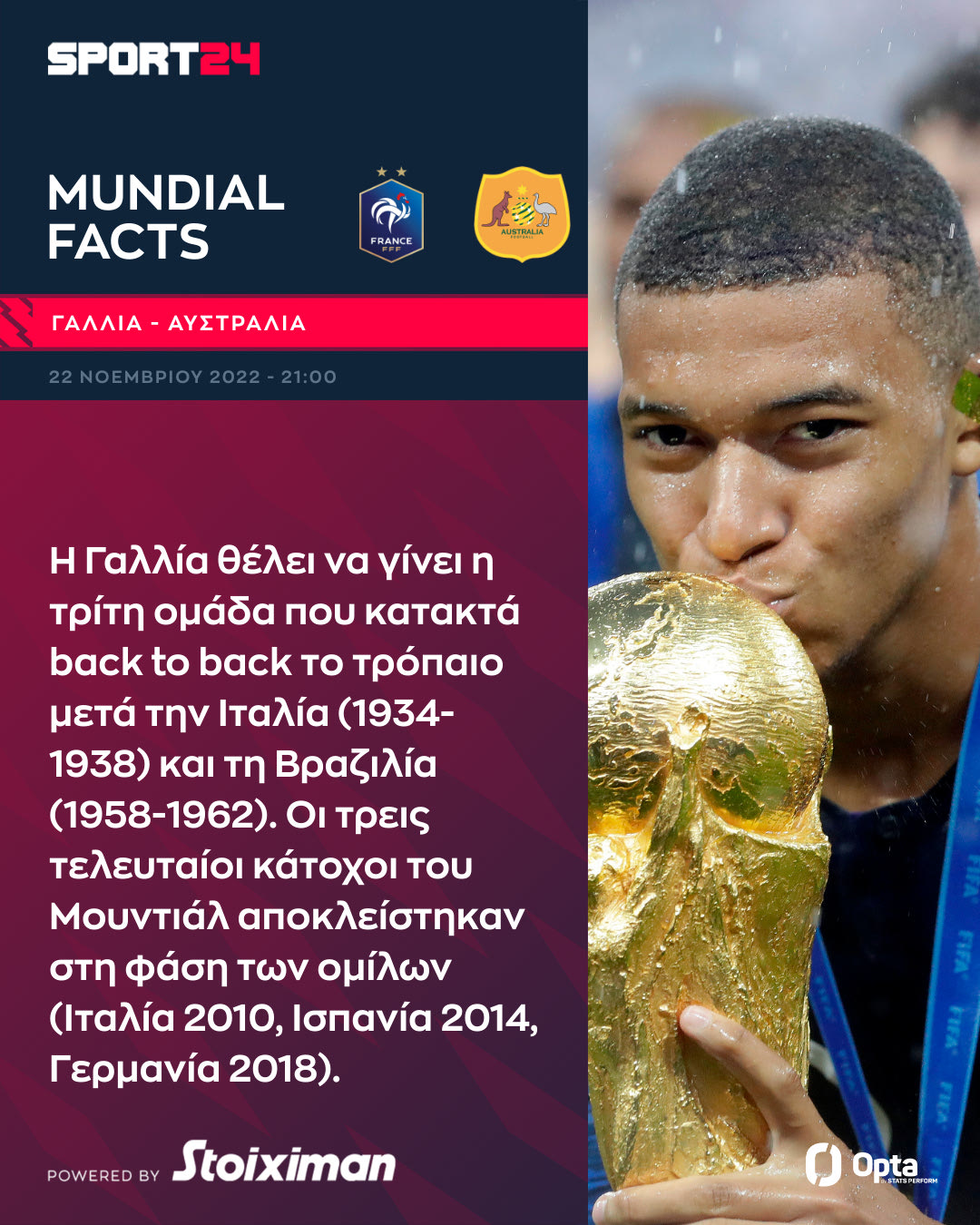 Η Γαλλία παίζει απέναντι στην Αυστραλία (22/11, 21:00, ANT1, LIVE SPORT24) στο Al Janoub Stadium στην πρεμιέρα των Παγκόσμιων Πρωταθλητών του 2018 στα γήπεδα του Κατάρ. Δείτε ενδιαφέροντα facts του παιχνιδιού.