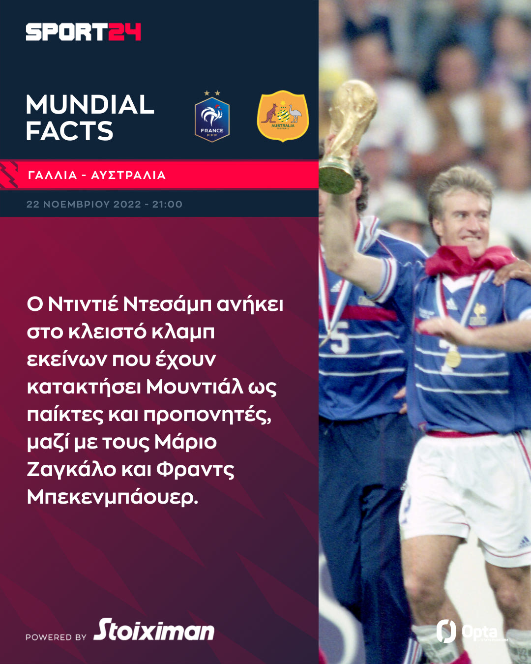 Η Γαλλία αντιμετωπίζει την Αυστραλία (22/11, 21:00, ANT1, LIVE SPORT24) στο παιχνίδι που ολοκληρώνει την πρώτη αγωνιστική του τετάρτου ομίλου στο Μουντιάλ του Κατάρ.