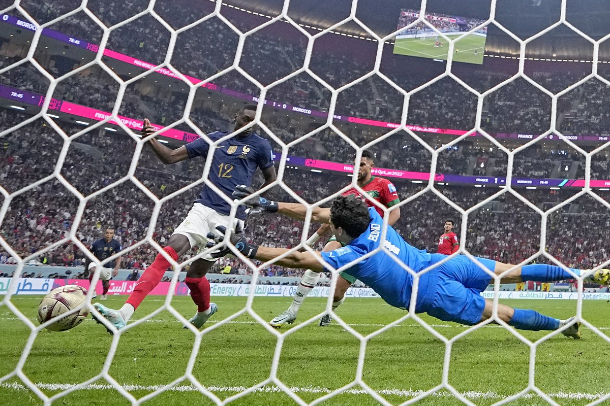 Η Γαλλία διπλασίασε τα τέρματά της απέναντι στο Μαρόκο στο 79ο λεπτό. Ο Εμπαπέ ελίχτηκε ωραία μέσα στην περιοχή του Μαρόκου και έκανε το σουτ έχοντας πέντε παίκτες να τον περικυκλώνουν, με τον Μουανί να ακολουθεί την πορεία της μπάλας και με κοντινό πλασέ, στην πρώτη επαφή του με τη μπάλα, να νικάει τον Μπόνο.
