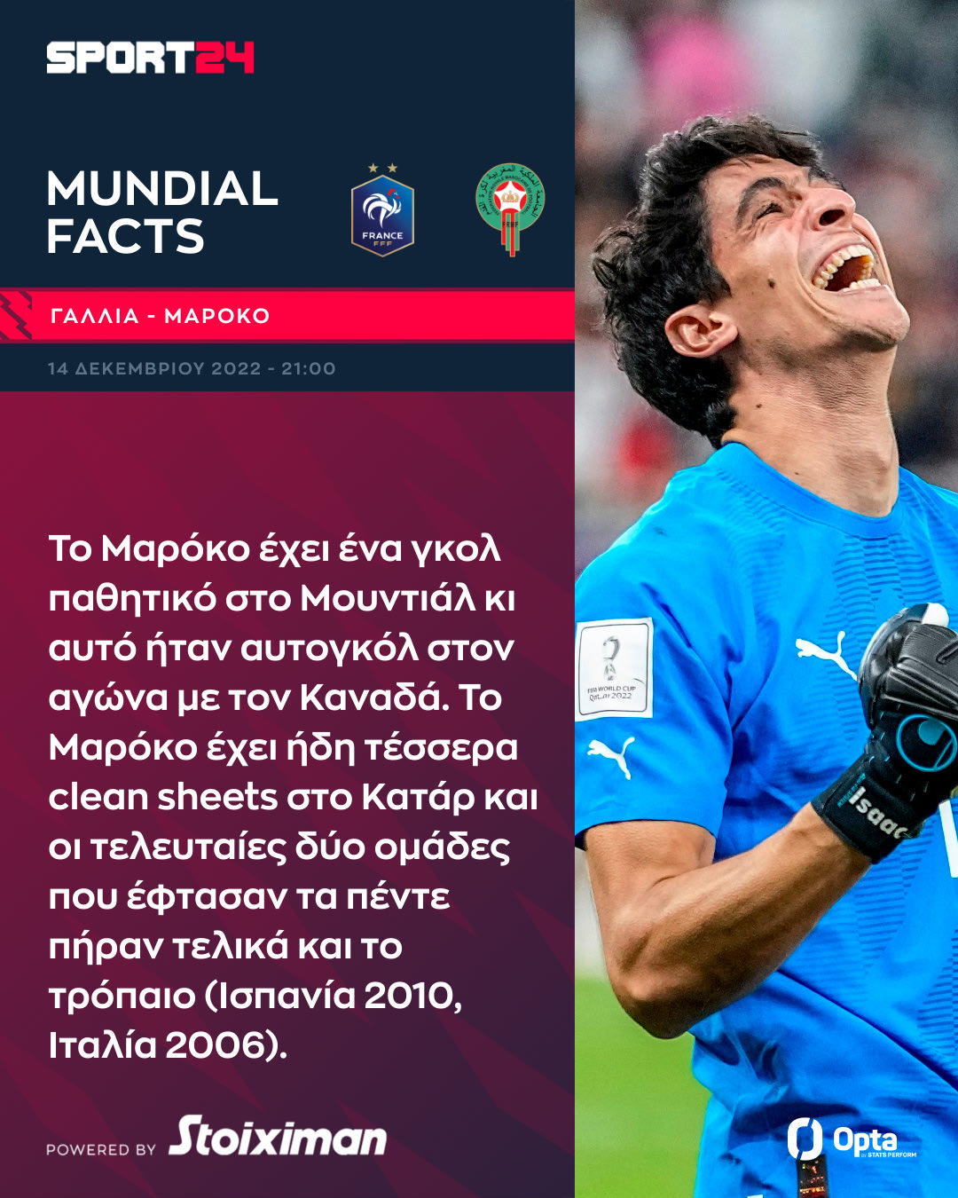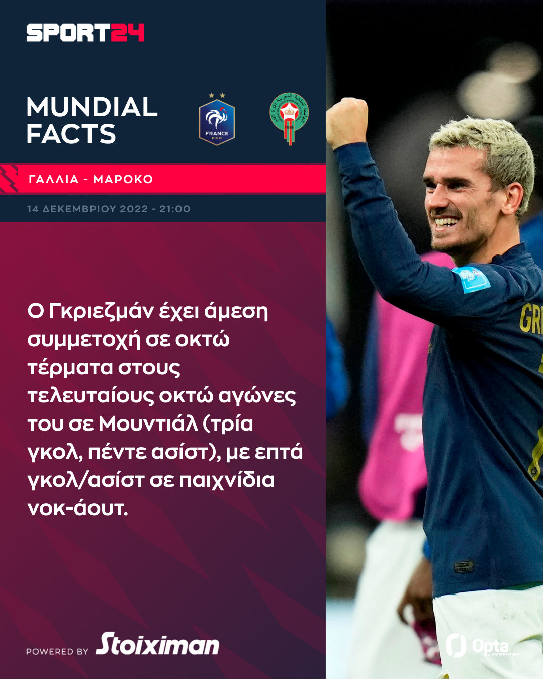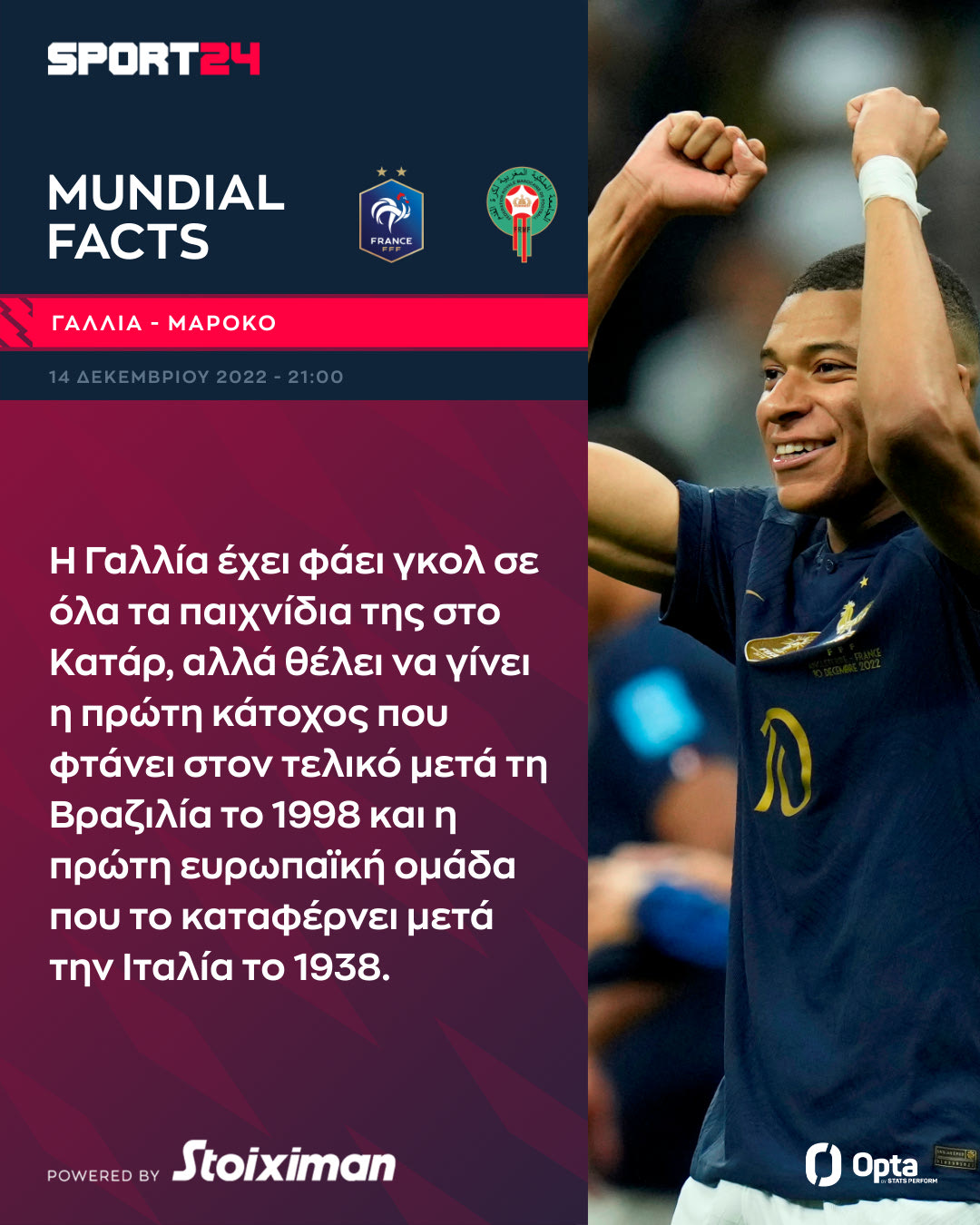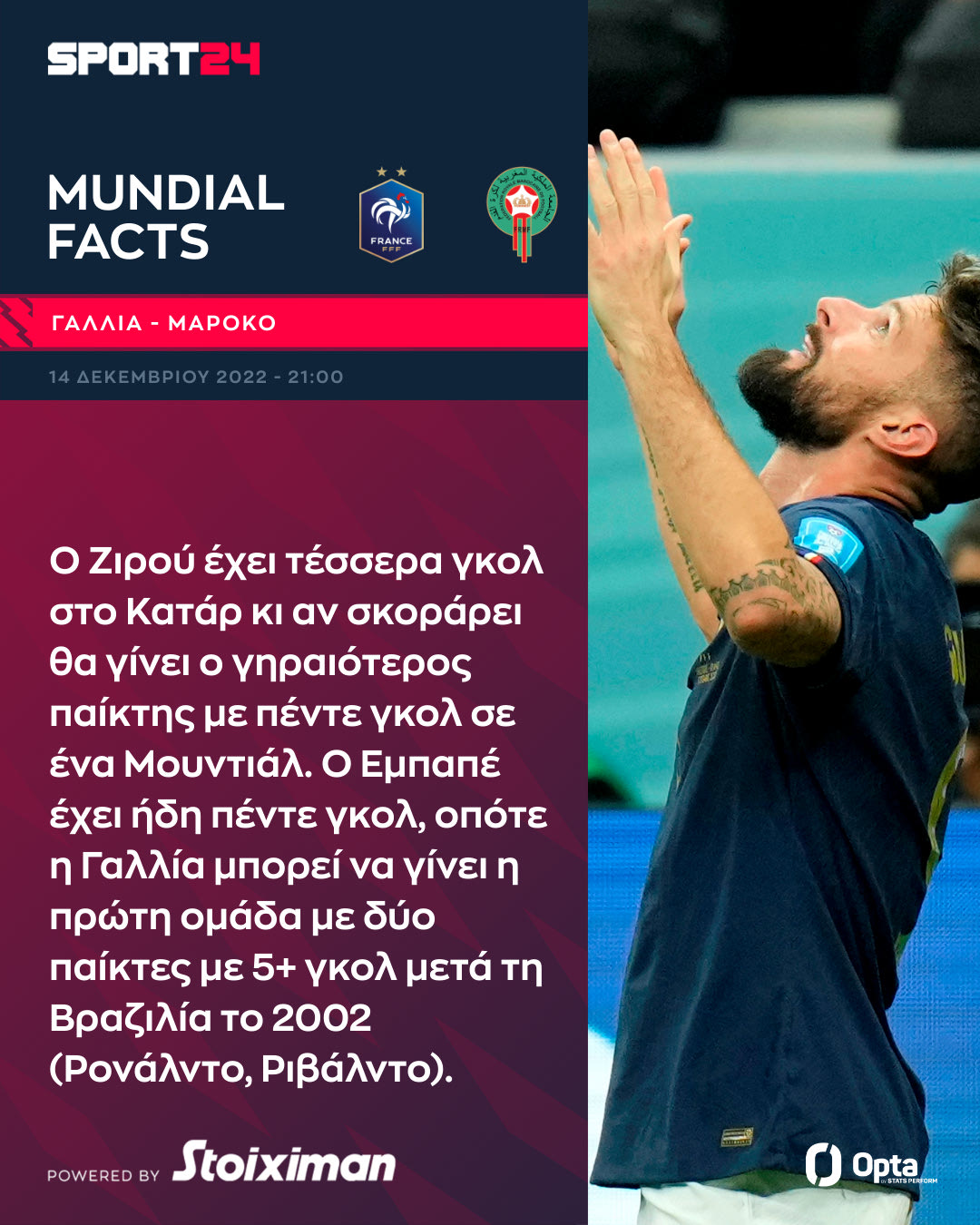 Ο Ζιρού έχει τέσσερα γκολ στο Κατάρ κι αν σκοράρει θα γίνει ο γηραιότερος παίκτης που βάζει πέντε γκολ σε ένα Μουντιάλ. Ο Εμπαπέ έχει ήδη πέντε γκολ, οπότε η Γαλλία μπορεί να γίνει η πρώτη ομάδα με δύο παίκτες με 5+ γκολ μετά τη Βραζιλία το 2002 (Ρονάλντο, Ριβάλντο).