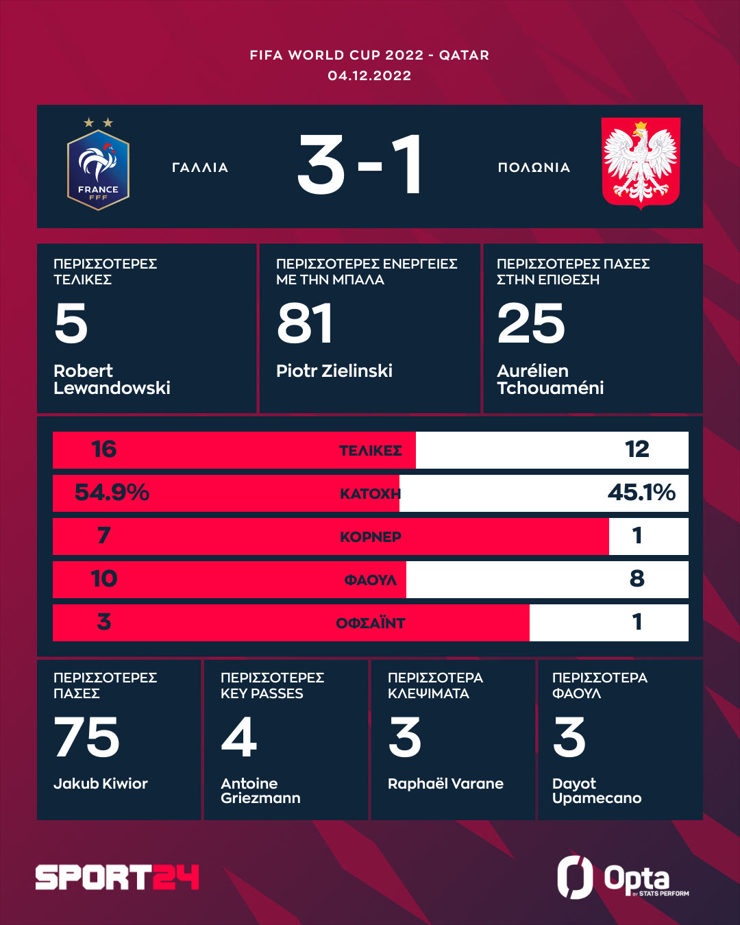 Το μόνο που πέτυχαν οι φιλότιμοι και αξιόμαχοι σε μεγάλο βαθμό Πολωνοί ήταν να πετύχουν το γκολ της τιμής με τον Ρόμπερτ Λεβαντόβσκι από την άσπρη βούλα στο ένατο λεπτό των καθυστερήσεων, με το φινάλε να βρίσκει την Γαλλία να πανηγυρίζει μία μεγάλη και άξια νίκη και να περιμένει την αντίπαλό της στους 8, που θα προκύψει από το ζευγάρι Αγγλία – Σενεγάλη.